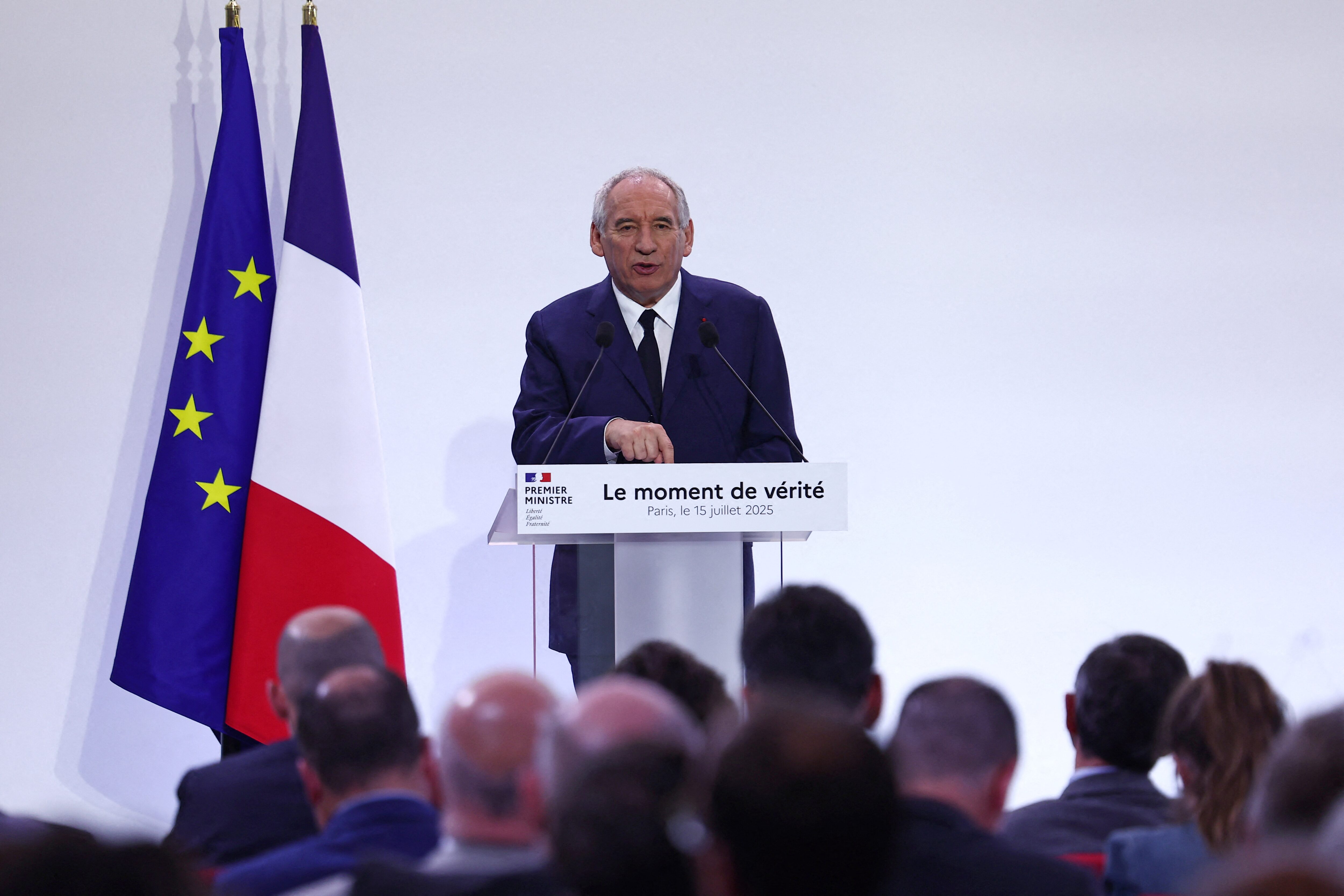 檔案:法國總理弗朗索瓦·貝魯於2025年7月15日在巴黎舉行的新聞發佈會上介紹了一項全面整頓公共財政的計劃,其中提出了2026年的首批預算政策指導方針。口號是“此刻的… 購買許可 權利,打開新標籤頁閲讀更多巴黎,7月15日(路透社)——在法國,緊縮計劃使總理弗朗索瓦·貝魯的少數派政府陷入危機。貝魯於週二宣佈了嚴厲的削減措施和近440億歐元的緊縮方案。貝魯在巴黎表示,法國必須迅速採取行動,以免被債務負擔“壓垮”。極右翼政黨“國民聯盟”(RN)主席馬琳·勒龐立即宣佈,如果政府首腦不放棄其計劃,將提出不信任動議。左翼政黨也表達了批評意見。