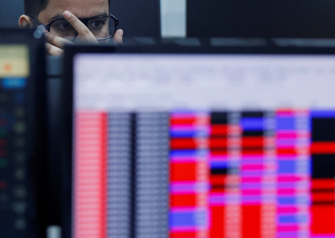 圖集1/2 2024年7月23日,印度孟買一家證券經紀公司內,一名經紀人在電腦終端前做出反應。路透社/Francis Mascarenhas/資料圖片
