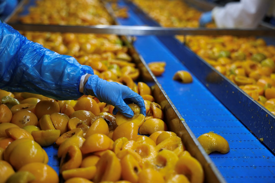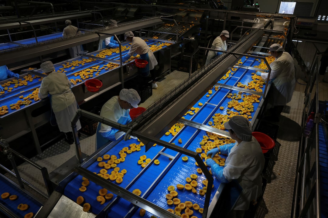 本週,卡車在約安尼迪斯的工廠卸下一箱箱滿載數千個黃桃的板條箱,這些桃子隨後被送上傳送帶進行加工。