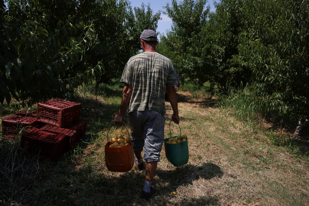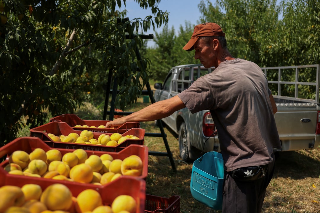 8項中的第1項 2025年7月15日,希臘納烏薩,一名農民在田間採摘桃子。路透社/Alexandros Avramidis