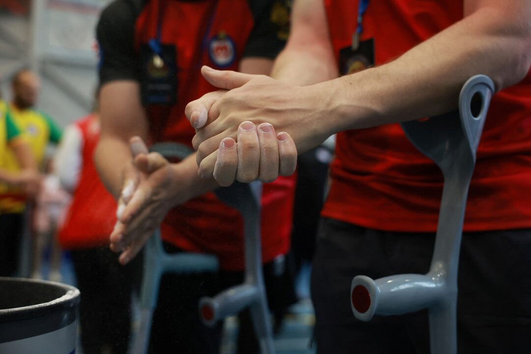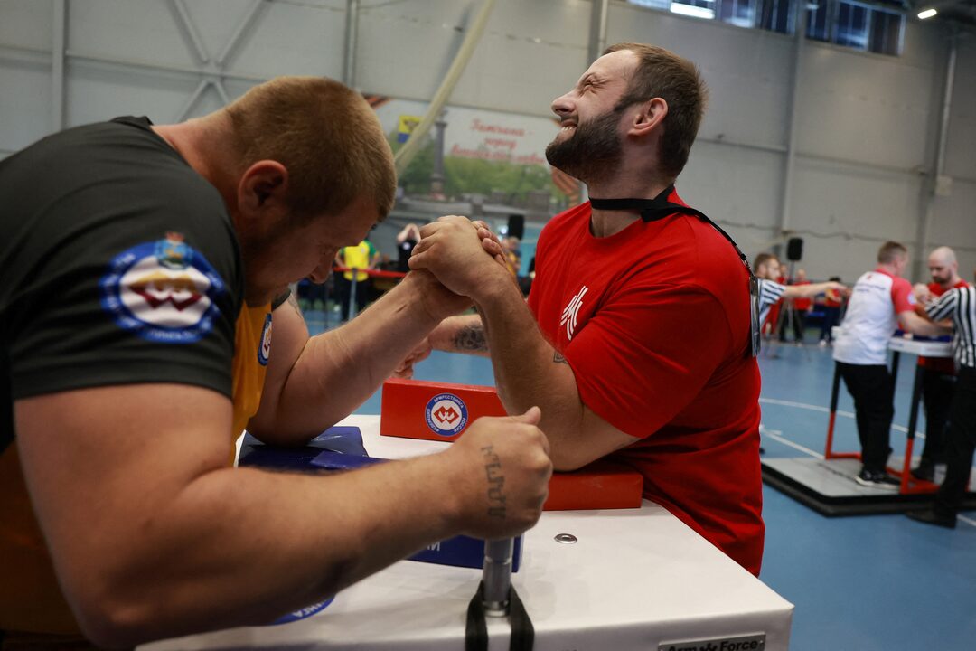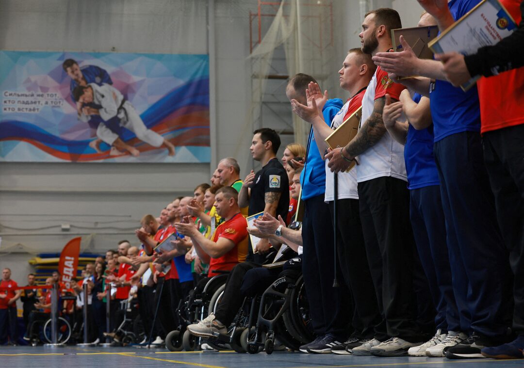 圖1/4:在俄羅斯列寧格勒地區加特契納舉行的自由式摔跤比賽中,俄烏衝突中受傷的俄羅斯軍人列隊。2025年7月6日。路透社/Anton Vaganov
