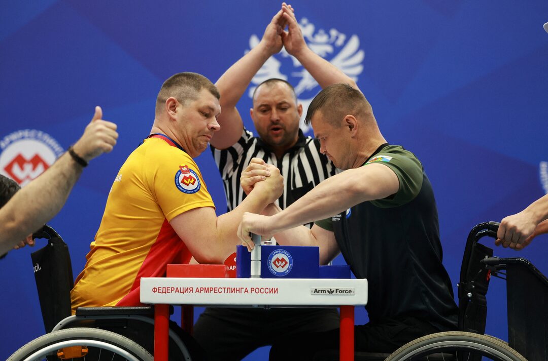 圖1/4:在俄羅斯列寧格勒地區加特契納舉行的自由式摔跤比賽中,俄烏衝突中受傷的俄羅斯軍人列隊。2025年7月6日。路透社/Anton Vaganov