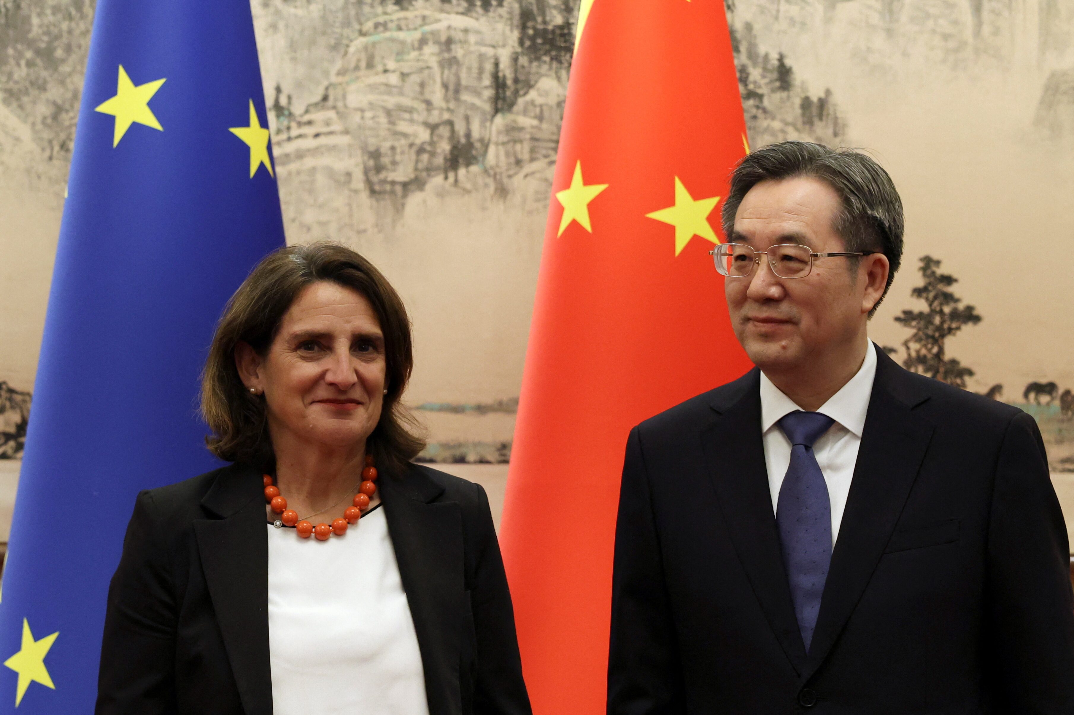 資料照片。中國國務院副總理丁薛祥與歐盟委員會負責公平綠色競爭轉型的執行副主席特雷莎·裏貝拉在北京釣魚台國賓館合影。2025年7月14日。路透社/Florence Lo/Pool 購買授權 許可,打開新標籤頁北京,7月16日(路透社)- 中國週三重申將推動與歐洲議會關係正常化。當前北京正尋求在全球貿易摩擦加劇的背景下加強與布魯塞爾的經濟和政治聯繫。