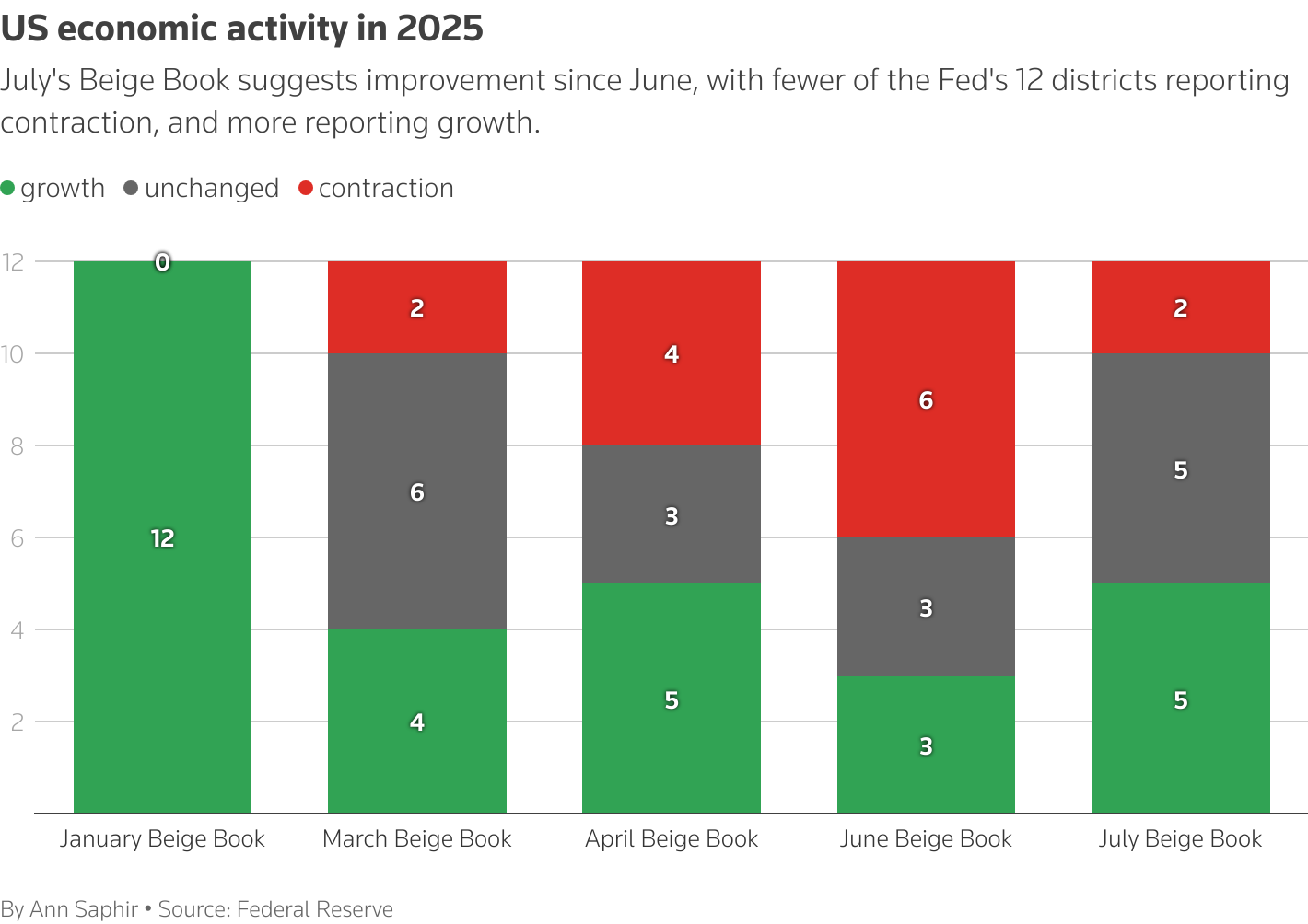 自1月份以來,顯示報告經濟增長的美聯儲地區數量下降、而報告經濟收縮的地區數量增加的柱狀圖。