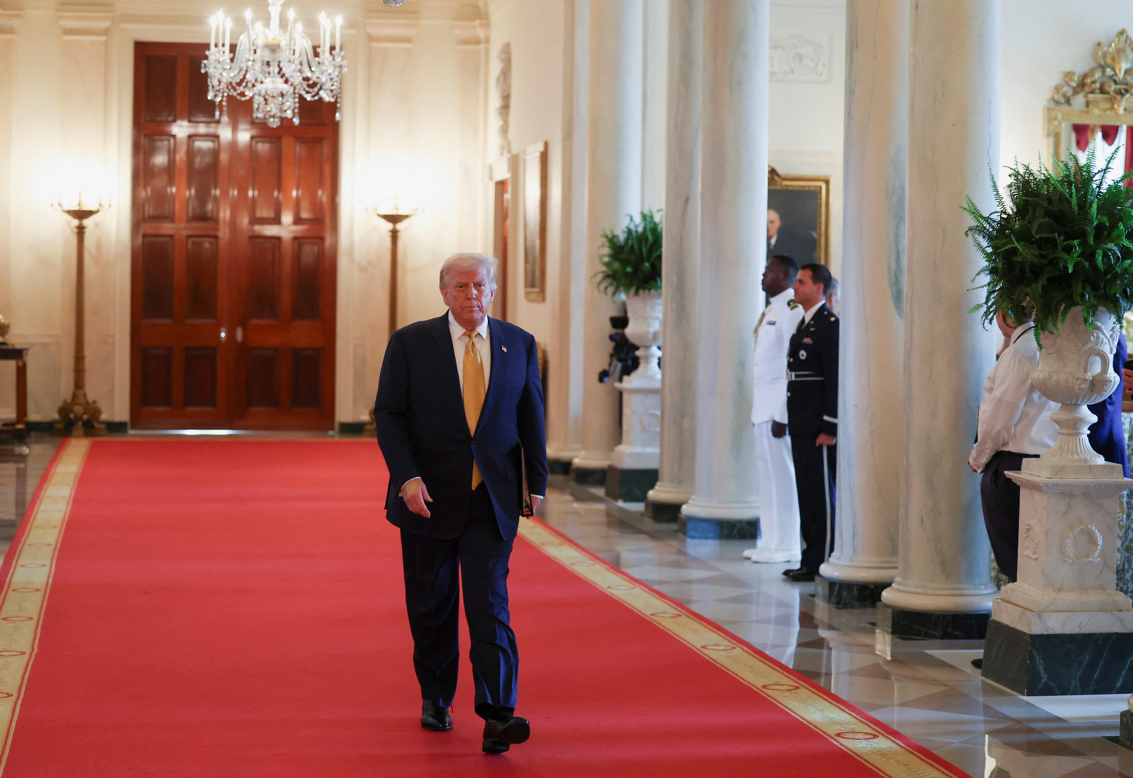 2025年7月16日,美國總統唐納德·特朗普在華盛頓特區白宮東廳簽署《停止芬太尼法案》當日行走。路透社/Umit Bektas 購買授權 許可,打開新標籤頁7月16日(路透社) - 白宮週三表示,美國總統唐納德·特朗普計劃於週四下午東部時間16:00(格林尼治時間20:00)簽署行政命令,但未具體説明這些命令的主題。
