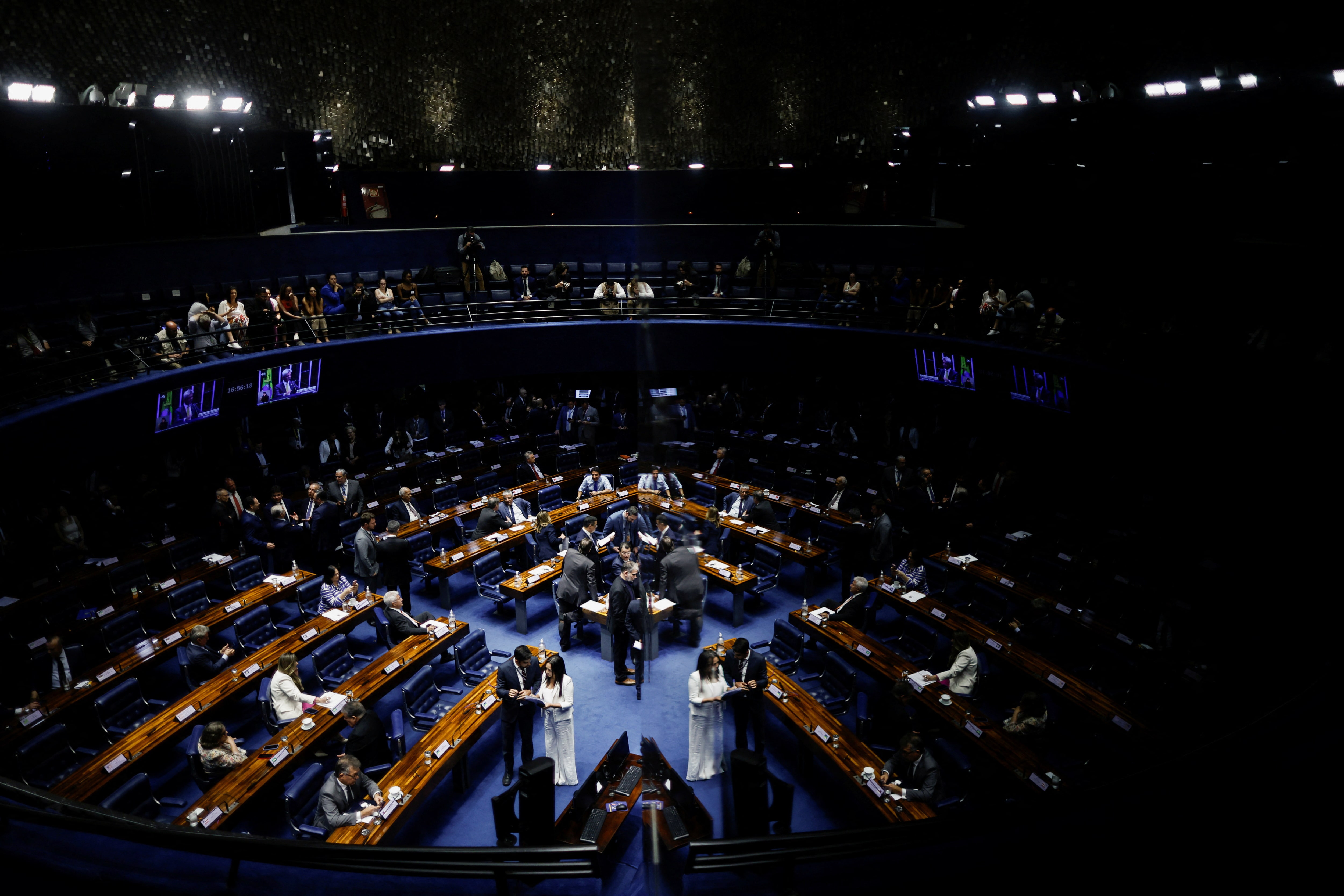 2023年11月8日,巴西首都巴西利亞,聯邦參議院會議期間的場景。路透社/阿德里亞諾·馬查多/資料圖片購買授權權利,打開新標籤頁路透聖保羅7月16日電 - 巴西參議院週三在首輪投票中通過了一項憲法修正案,將從2027年起改變政府對法院判決債務的會計處理方式,此舉可能幫助政府實現曾被視作難以達成的財政目標。