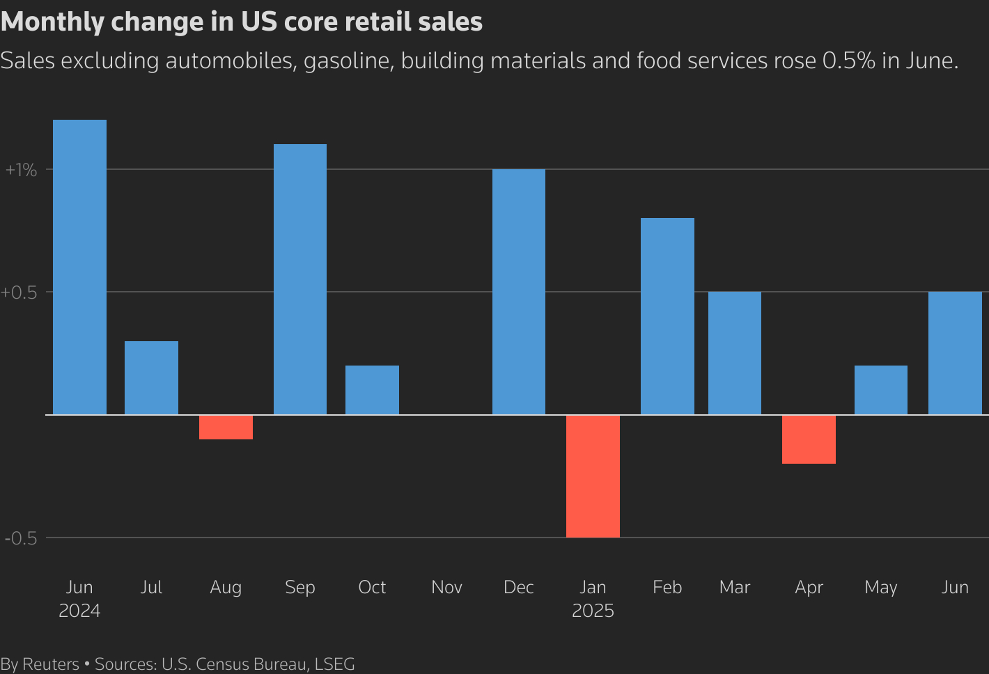 題為"美國核心零售銷售月度變化"的柱狀圖,展示了過去一年該指標的變化趨勢。