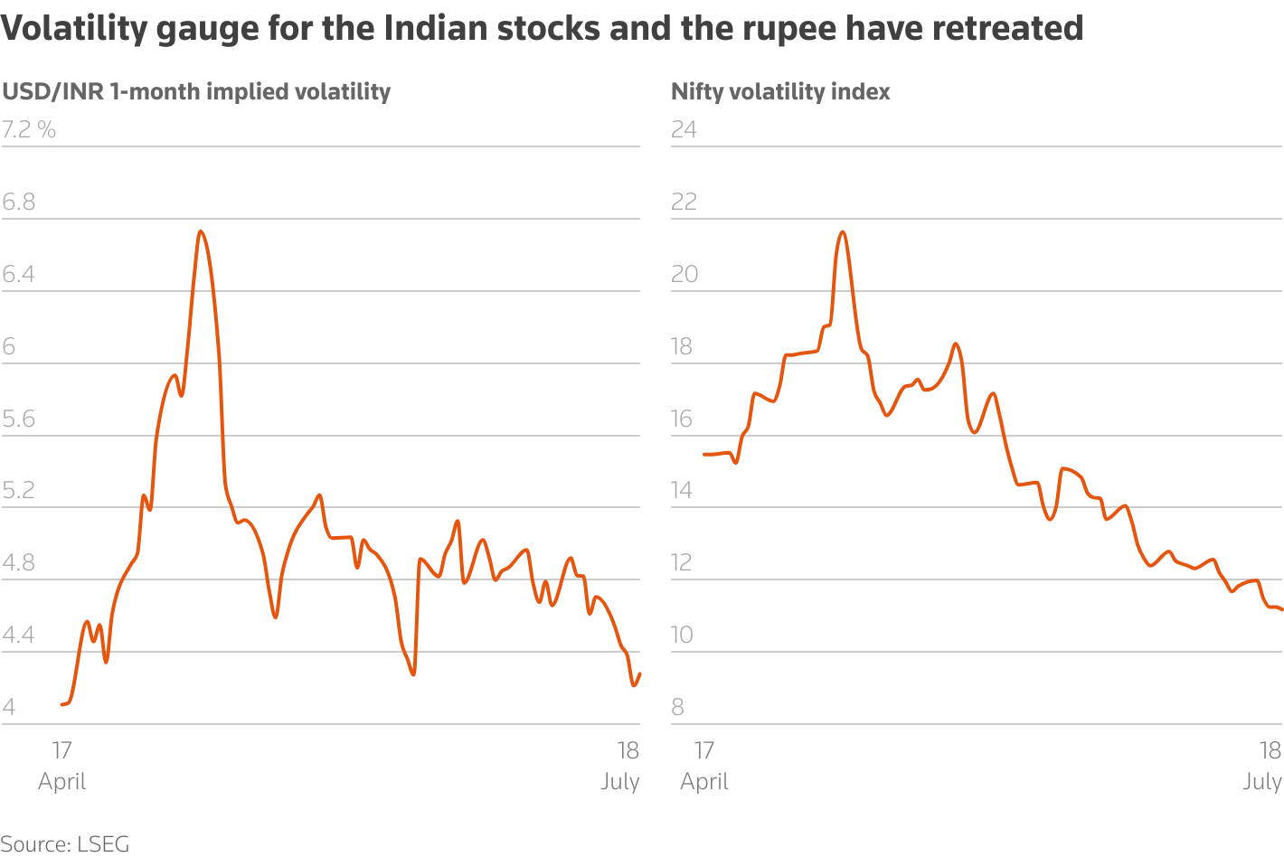 盧比與基準Nifty 50指數的30天相關性已升至0.66,為5月中旬以來的最高水平,表明該貨幣對本地股市波動的敏感性增強。