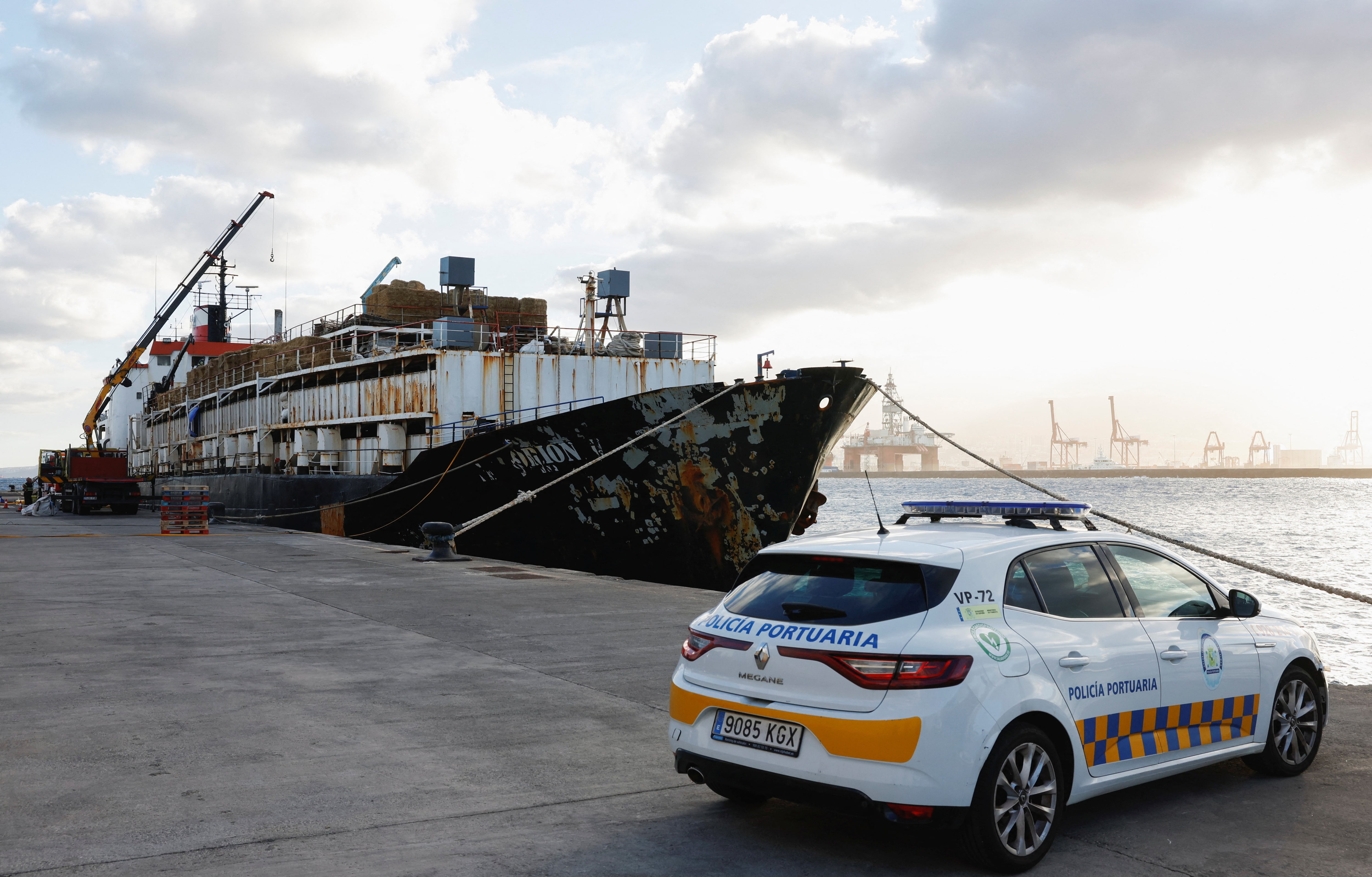 2023年1月26日,西班牙大加那利島拉斯帕爾馬斯港,警方從被扣押的"獵户座V號"牲畜運輸船上卸載毒品,一輛警車停在一旁。路透社/Borja Suarez/資料圖片購買授權許可,打開新標籤頁雅典,7月18日(路透社)——2023年因從拉丁美洲向歐洲運輸四噸多可卡因(混裝於咖啡豆中)而被西班牙扣押的貨船前希臘船東,其律師週五否認與毒品存在任何關聯。