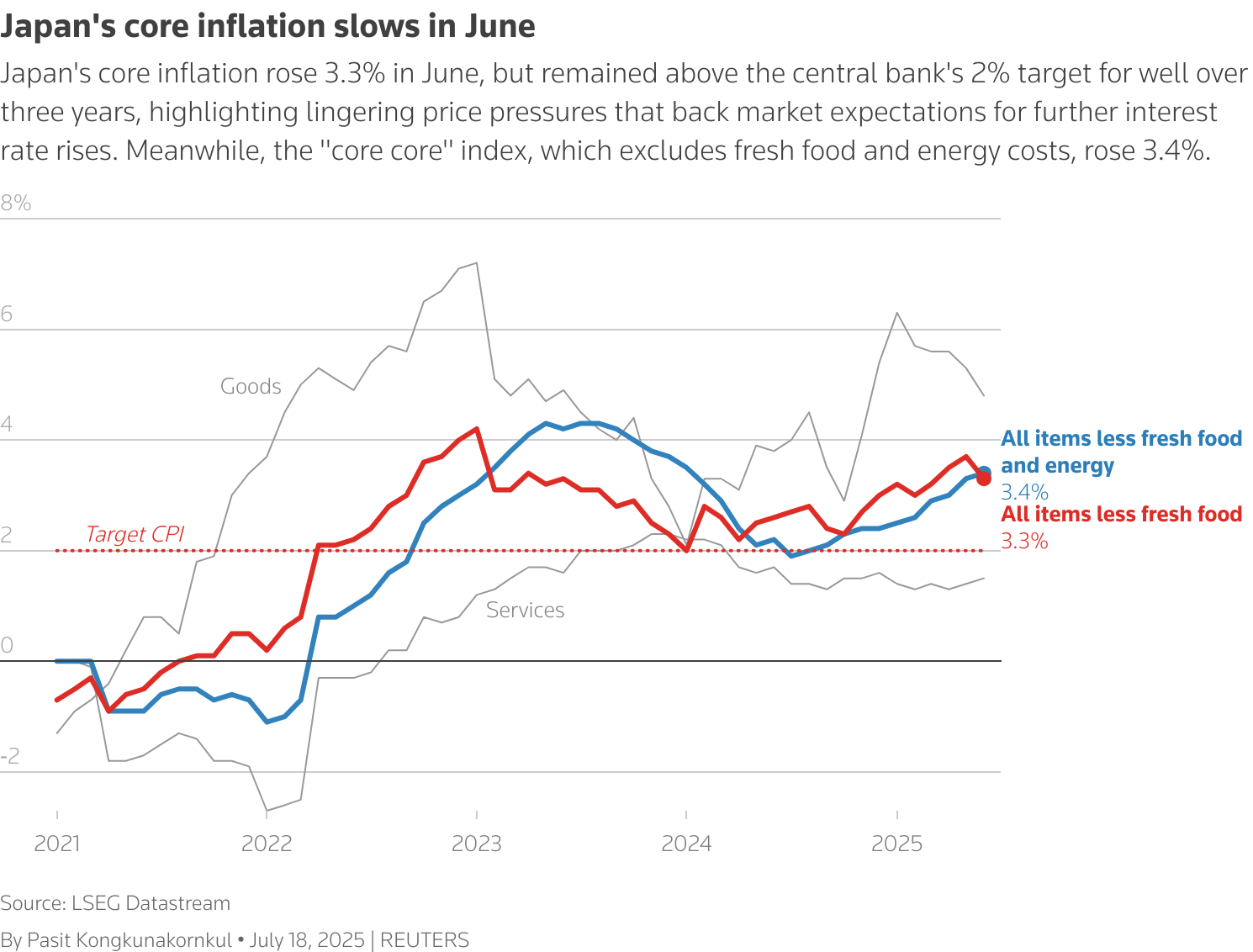 東京,7月18日(路透社)——日本核心通脹率在6月有所放緩,但仍連續三年多高於央行2%的目標,凸顯出持續的價格壓力支撐了市場對利率進一步上調的預期。