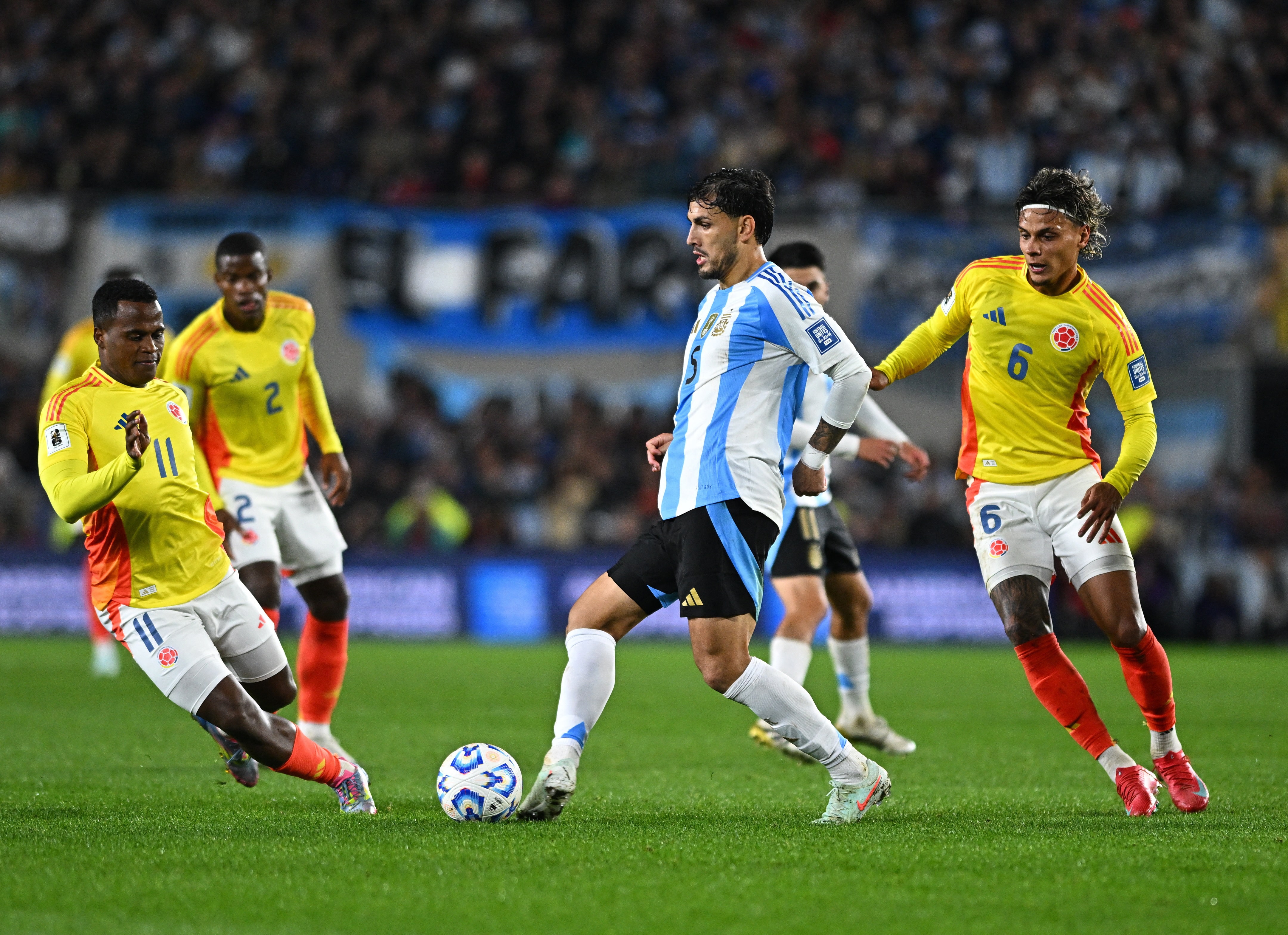 萊安德羅·帕雷德斯在2025年6月10日阿根廷布宜諾斯艾利斯紀念碑體育場舉行的阿根廷與哥倫比亞南美預選賽爭球檔案照片。
