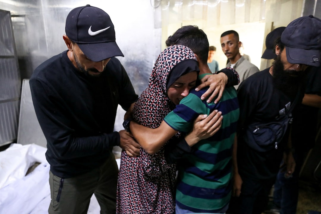2025年7月19日,加沙城希法醫院,巴勒斯坦人在清晨以色列空襲中遇難者的葬禮上,哀悼者在一具遺體旁悲痛不已。據醫護人員稱。路透社/Mahmoud Issa 購買授權 許可,打開新標籤頁加沙,7月19日(路透社)——據加沙衞生部和汗尤尼斯的納賽爾醫院稱,週六黎明時分,至少有36人在前往加沙援助分發點的途中被以色列軍隊開火打死。