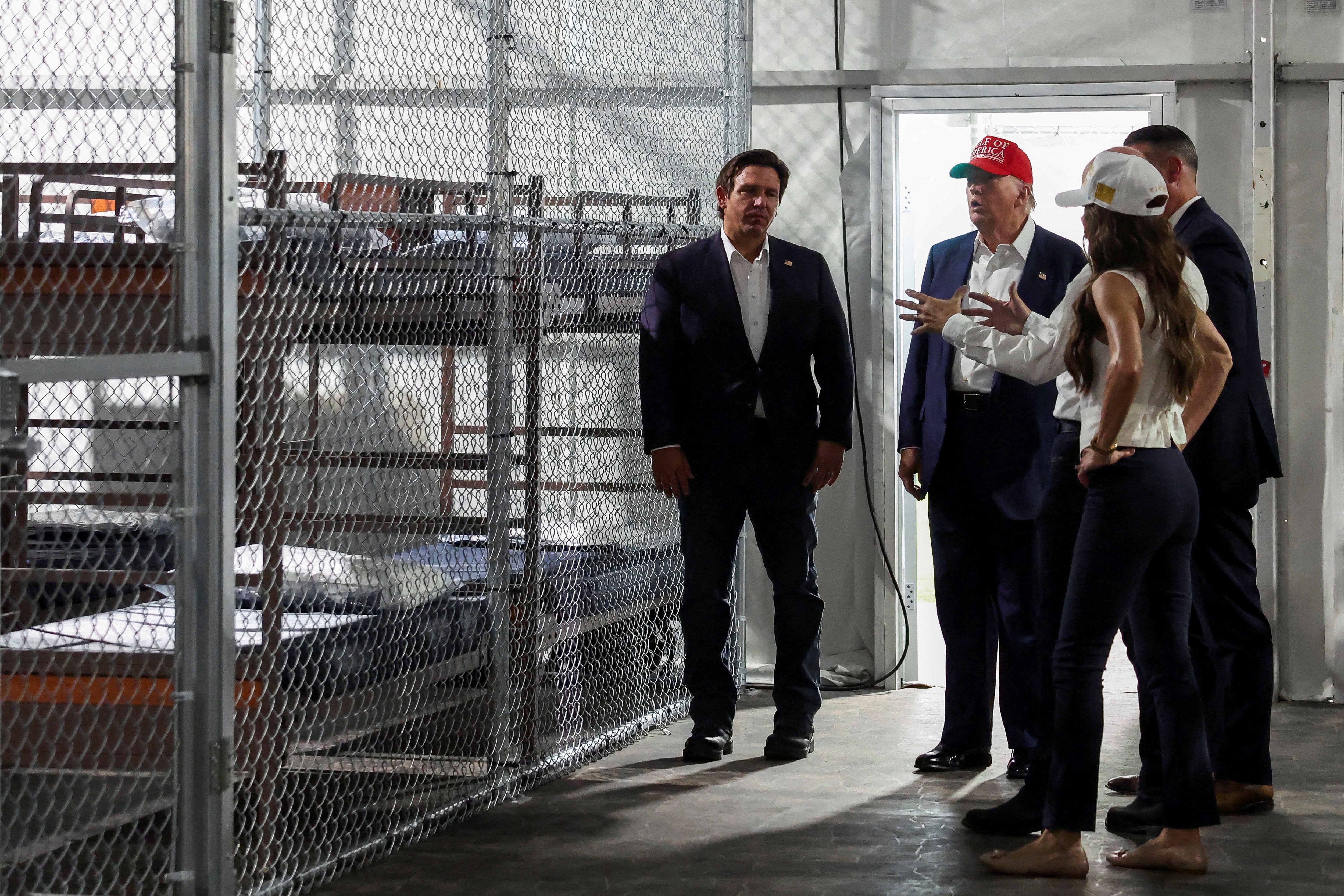 2025年7月1日,美國總統唐納德·特朗普、佛羅里達州州長羅恩·德桑蒂斯和美國國土安全部長克里斯蒂·諾姆參觀位於美國佛羅里達州奧喬皮的非正式稱為"鱷魚阿爾卡特拉斯"的臨時移民拘留中心。路透社/伊芙琳·霍克斯坦/資料圖片購買授權權利,打開新標籤頁7月19日(路透社)- 據《華爾街日報》週六報道,美國移民和海關執法局在獲得450億美元新資金後,正競相在全國範圍內建立移民帳篷營地,目標是在年底前將拘留能力從4萬張牀位擴大到10萬張。獲得450億美元的新資金後,正競相在全國範圍內建立移民帳篷營地,目標是在年底前將拘留能力從4萬張牀位擴大到10萬張,《華爾街日報》週六報道。報道補充説,該機構正在優先考慮在軍事基地和ICE監獄建立大規模帳篷設施,包括德克薩斯州布利斯堡的一個5000張牀位的場地,以及科羅拉多州、印第安納州和新澤西州的其他場地,援引《華爾街日報》看到的文件。