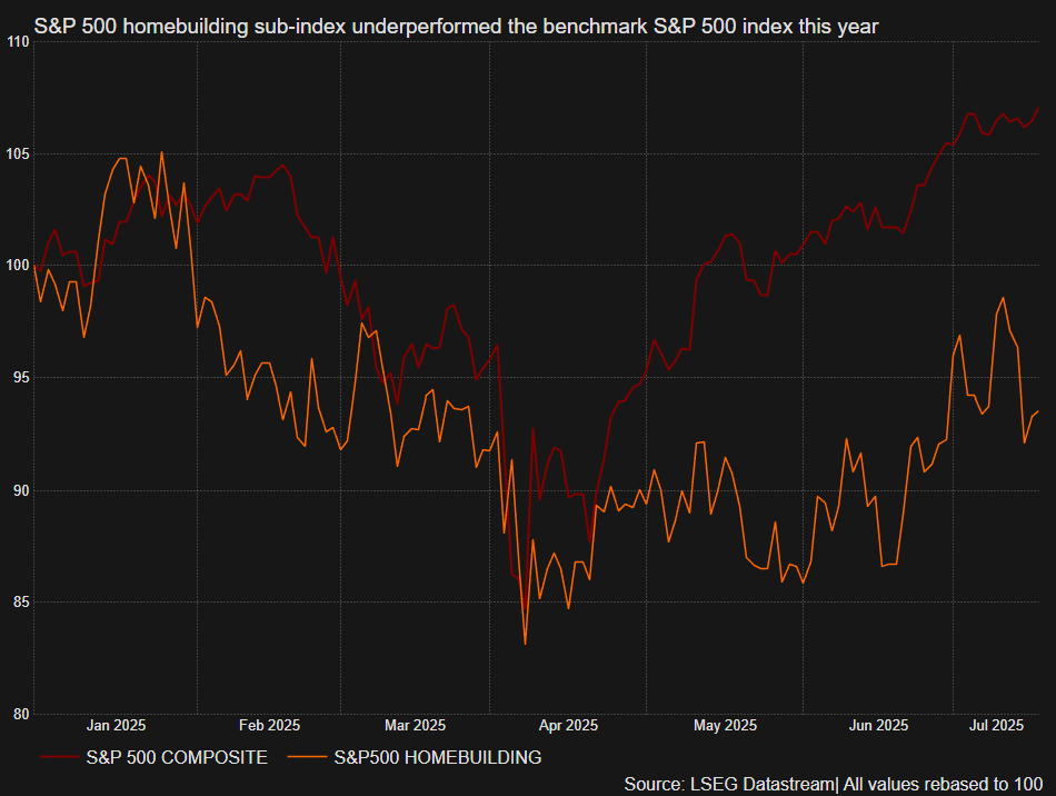 ** 標普500房屋建築子指數(.SPLRCHOME),打開新標籤頁今年以來下跌超過6%,而2024年下跌1.5%,基準標普500指數(.SPX),打開新標籤頁則上漲約7%。