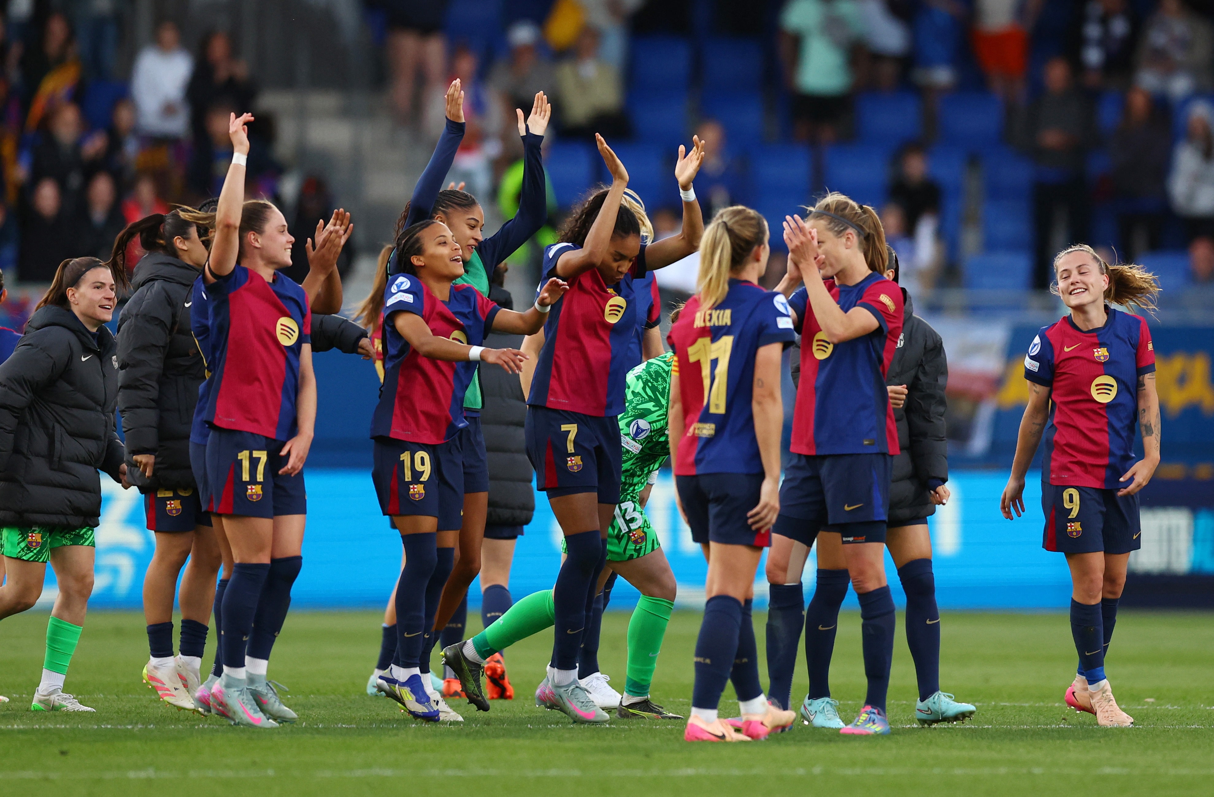 巴塞羅那女足球員維姬·洛佩斯、薩爾瑪·帕拉盧埃洛、克勞迪婭·皮娜和埃娃·帕約爾在歐冠半決賽首回合對陣切爾西后慶祝的檔案照片