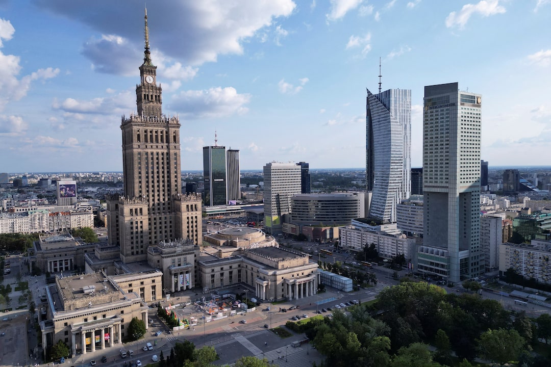 圖1/2 2025年7月18日,無人機航拍畫面展示了波蘭華沙的天際線,現代摩天大樓與華沙文化科學宮交相輝映。路透社/Kuba Stezycki