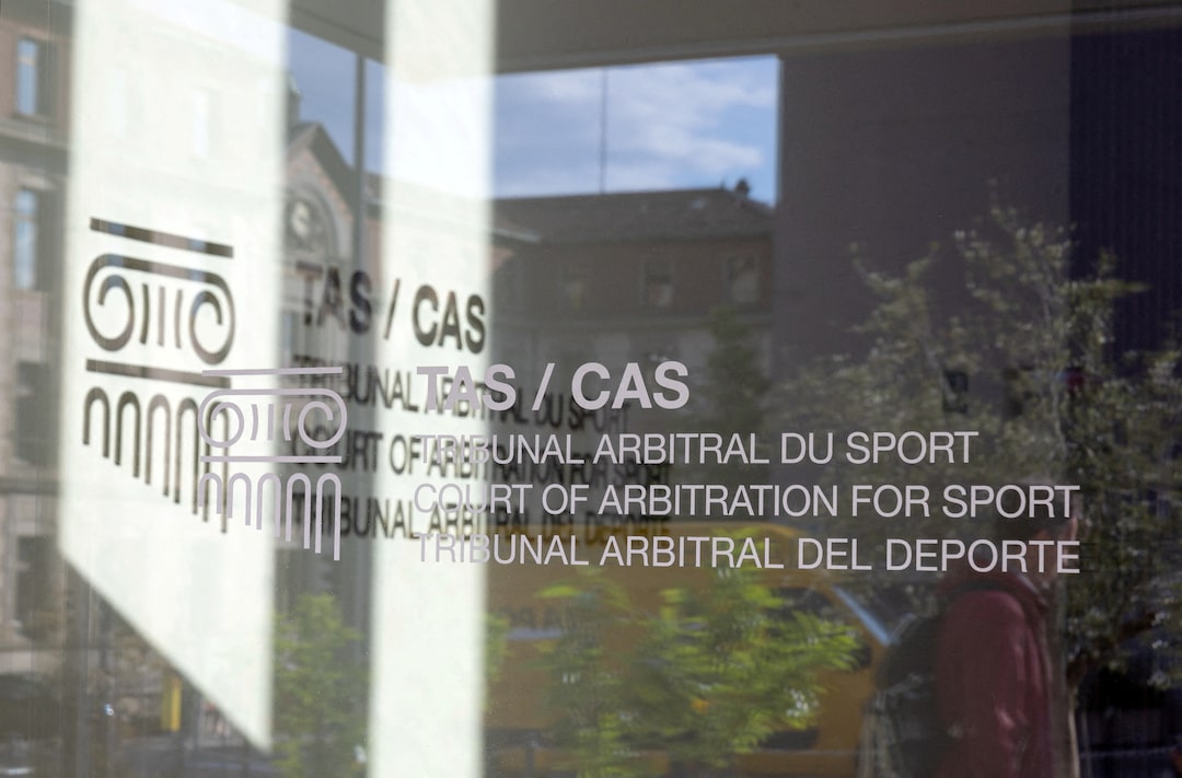 2024年5月14日,瑞士洛桑體育仲裁法庭(CAS)外景,體育仲裁法庭標誌一覽。路透社/Denis Balibouse/資料圖片