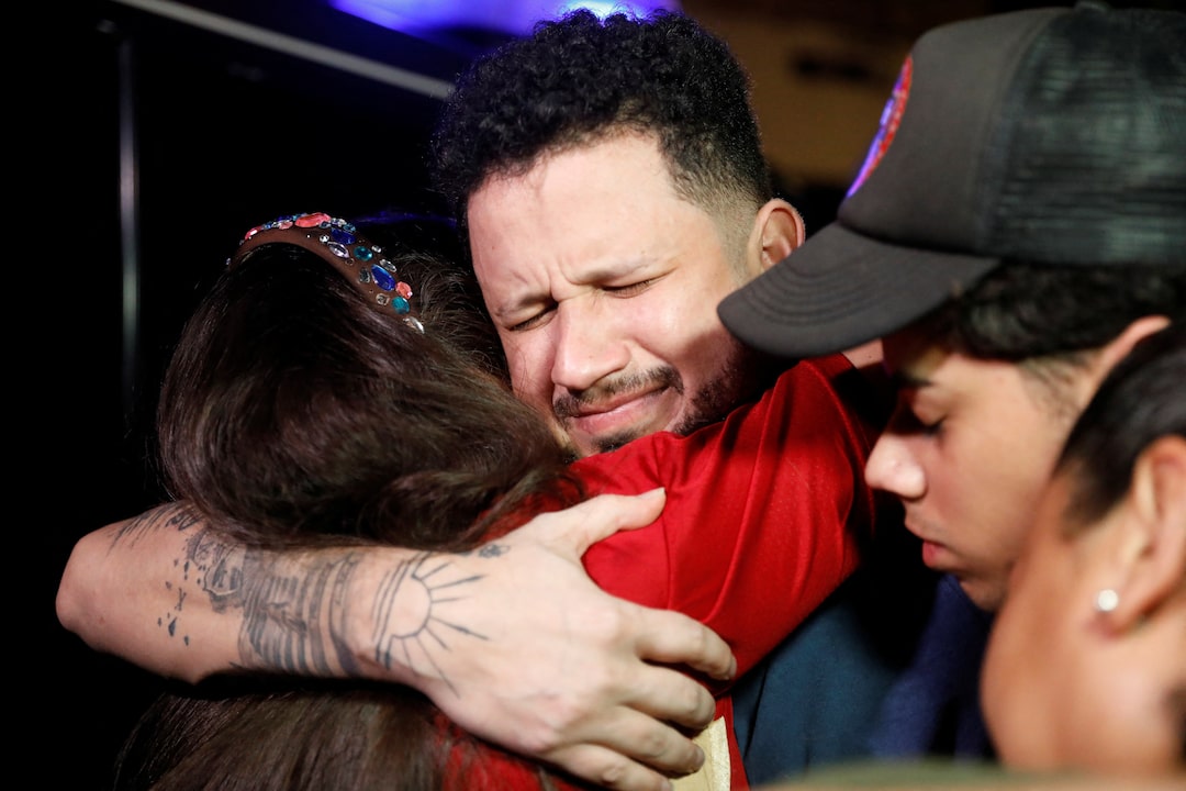 2025年7月22日,在委內瑞拉加拉加斯,被美國指控為特倫德阿拉瓜幫派成員並在薩爾瓦多監獄關押數月的阿圖羅·蘇亞雷斯獲釋後與家人相擁。路透社/萊昂納多·費爾南德斯·維洛里亞