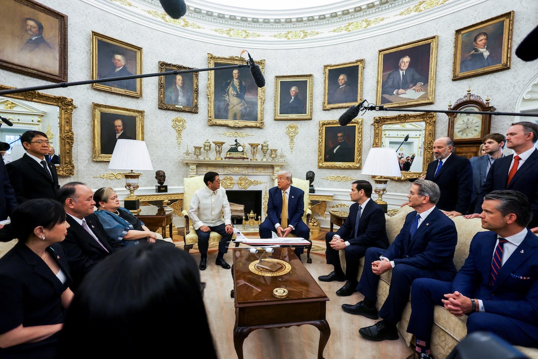 圖1/3:2025年7月22日,美國總統唐納德·特朗普在華盛頓特區白宮會見菲律賓總統小費迪南德·馬科斯,美國財政部長斯科特·貝森特、國務卿馬可·魯比奧和國防部長皮特·赫格塞思陪同。路透社/肯特·西村 重新發布 - 質量重複