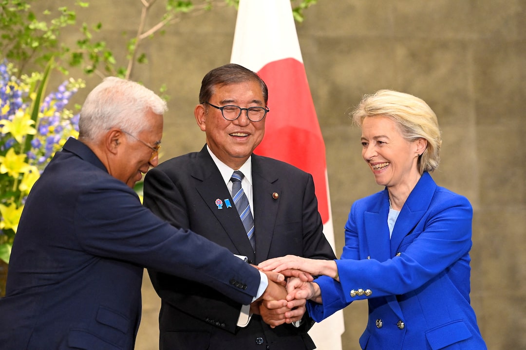 圖集1/3:2025年7月23日,日本東京首相官邸,歐盟委員會主席烏爾蘇拉·馮德萊恩、歐洲理事會主席安東尼奧·科斯塔與日本首相石破茂共同出席會議。David Mareuil/Pool via REUTERS