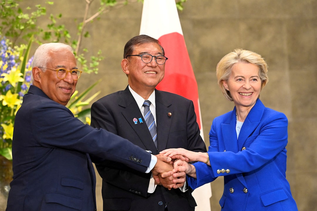 圖集1/3:2025年7月23日,日本東京首相官邸,歐盟委員會主席烏爾蘇拉·馮德萊恩、歐洲理事會主席安東尼奧·科斯塔與日本首相石破茂共同出席會議。David Mareuil/Pool via REUTERS