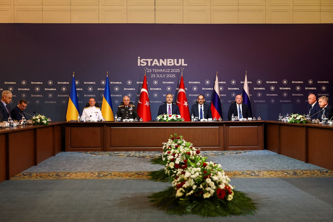 2025年7月23日,土耳其伊斯坦布爾,俄羅斯與烏克蘭第三輪和平會談當天,土耳其總參謀長梅廷·古拉克、土耳其外交部長哈坎·菲丹、土耳其情報局長易卜拉欣·卡林在切拉甘宮出席會議。路透社/穆拉德·塞澤爾