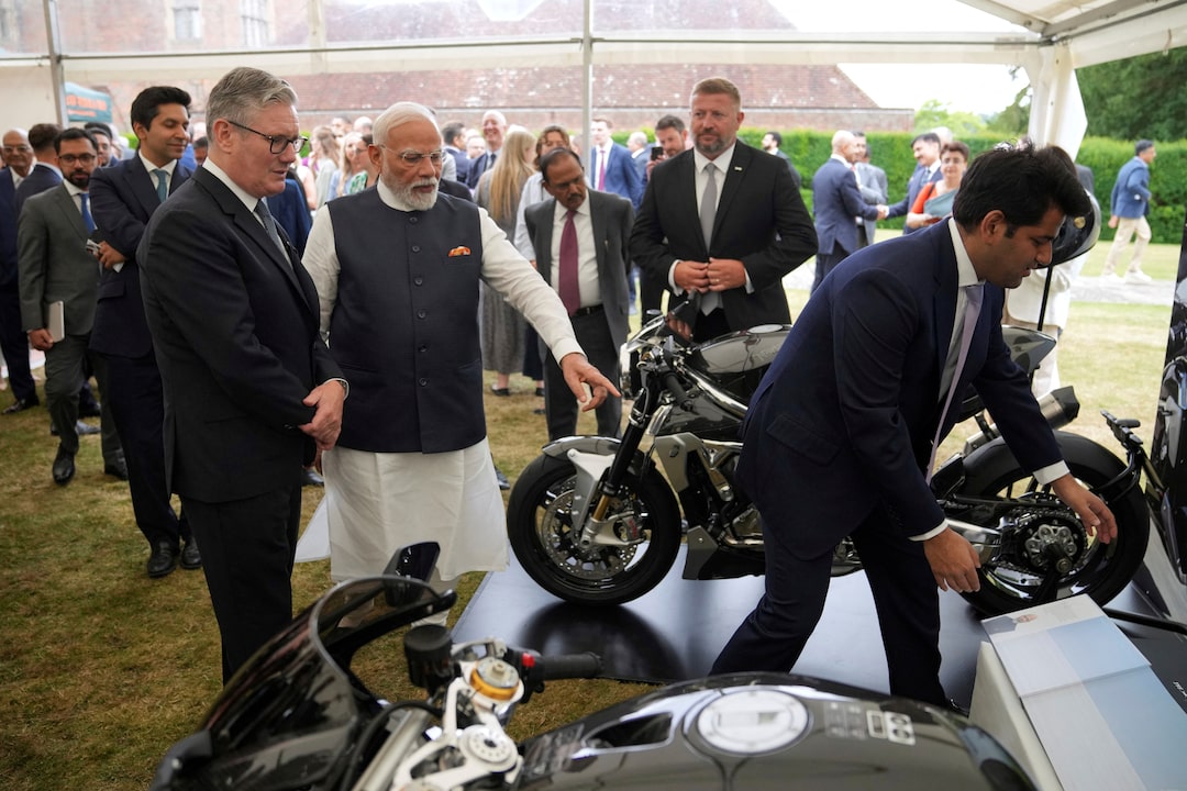 2025年7月24日星期四,英國首相基爾·斯塔默與印度總理納倫德拉·莫迪在英格蘭艾爾斯伯裏附近契克斯莊園舉行的商業展示活動上觀看摩托車。 Kin Cheung/Pool via REUTERS