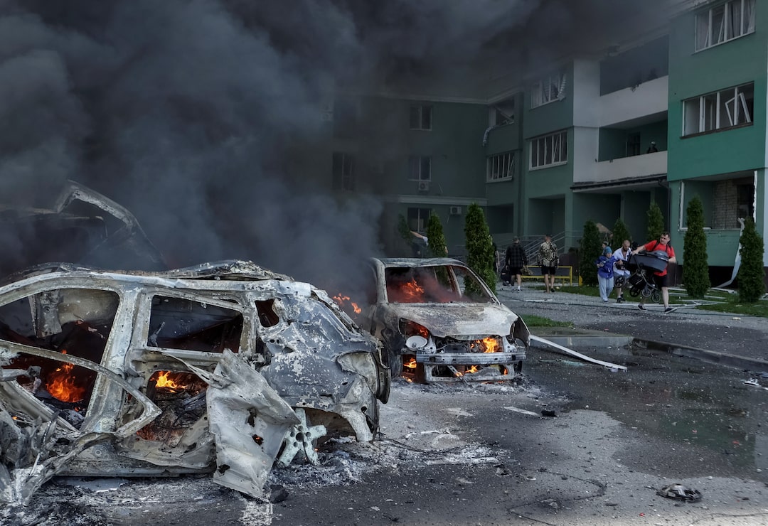 2025年7月24日,烏克蘭哈爾科夫,在俄羅斯對烏克蘭的襲擊中,俄羅斯空襲現場可見燃燒的汽車。路透社/Sofiia Gatilova