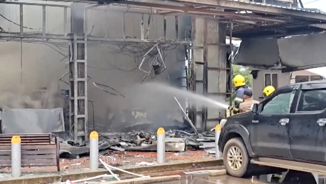 圖集1/6 2025年7月24日,在泰國四色菊府堪他拉叻縣,消防員正在加油站便利店滅火,當時泰國與柬埔寨正發生衝突。此截圖來自一段提供的視頻。TPBS/通過路透社提供