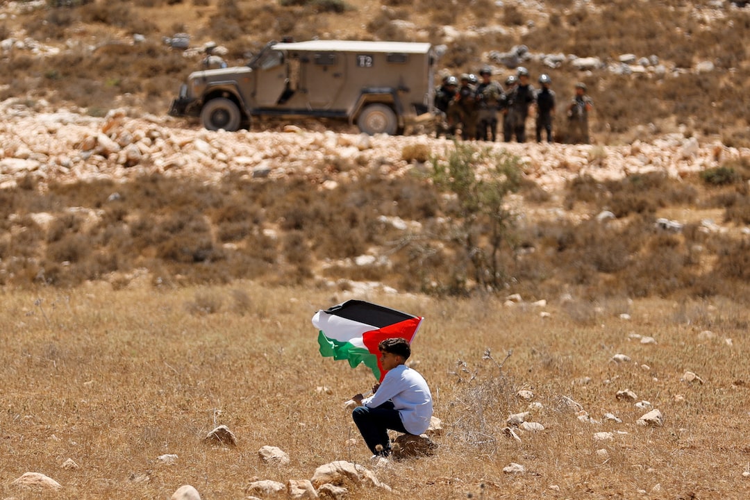 2025年7月18日,在以色列佔領的約旦河西岸傑寧附近的拉巴,一名男孩在示威活動中高舉巴勒斯坦國旗,抗議巴勒斯坦人所説的以色列沒收其土地的行為,以色列安全部隊在現場警戒。路透社/Raneen Sawafta 當日焦點圖片 購買授權許可,打開新標籤頁路透巴黎/華盛頓7月24日電 - 法國總統馬克龍週四表示,法國計劃在9月的聯合國大會上承認巴勒斯坦國,以期推動該地區和平,但該計劃引發了以色列和美國的憤怒譴責。