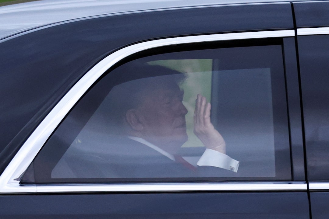2025年7月25日,美國總統唐納德·特朗普在英國蘇格蘭普雷斯特維克的格拉斯哥普雷斯特威克機場走下空軍一號時揮手致意。路透社/Evelyn Hockstein 購買授權許可,打開新標籤頁兩位知情人士表示,白宮官員希望趁特朗普出訪期間讓爭議逐漸平息。