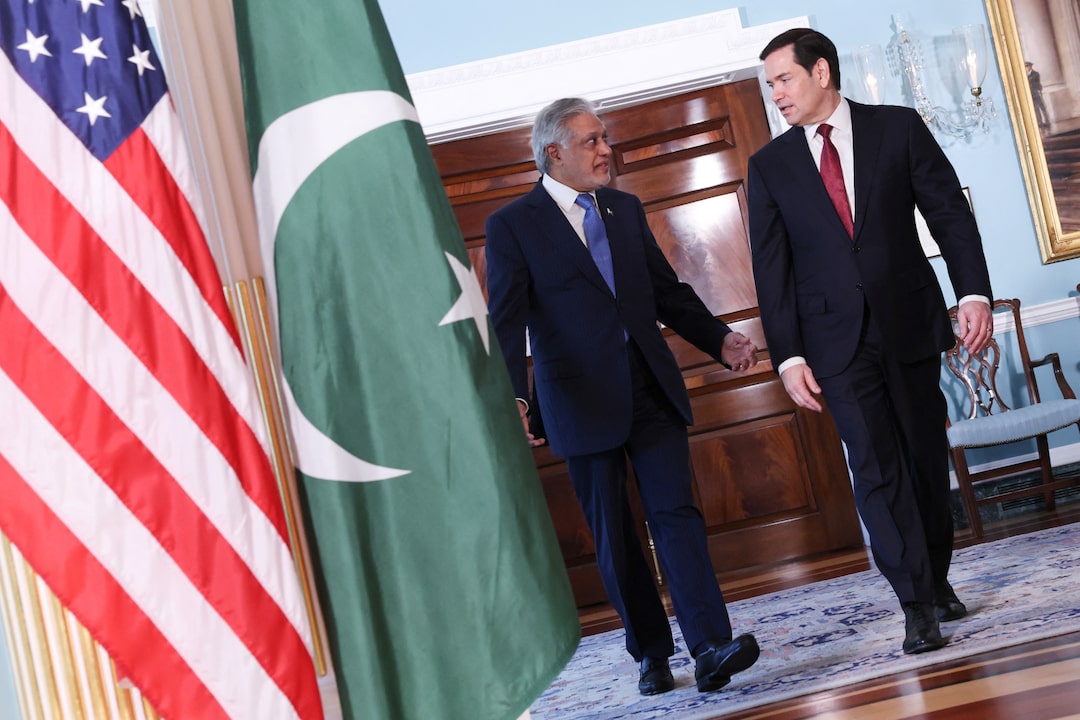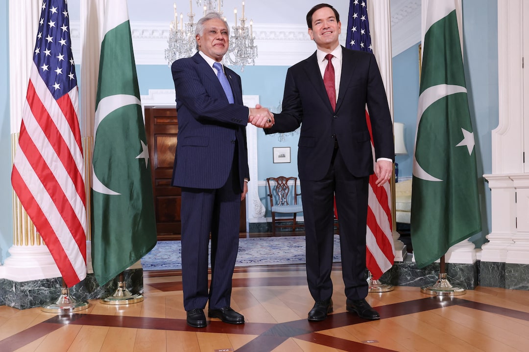 圖集1/3:2025年7月25日,美國華盛頓特區國務院,美國國務卿馬可·魯比奧與巴基斯坦副總理兼外交部長伊沙克·達爾向聚集的記者握手。路透社/喬納森·恩斯特