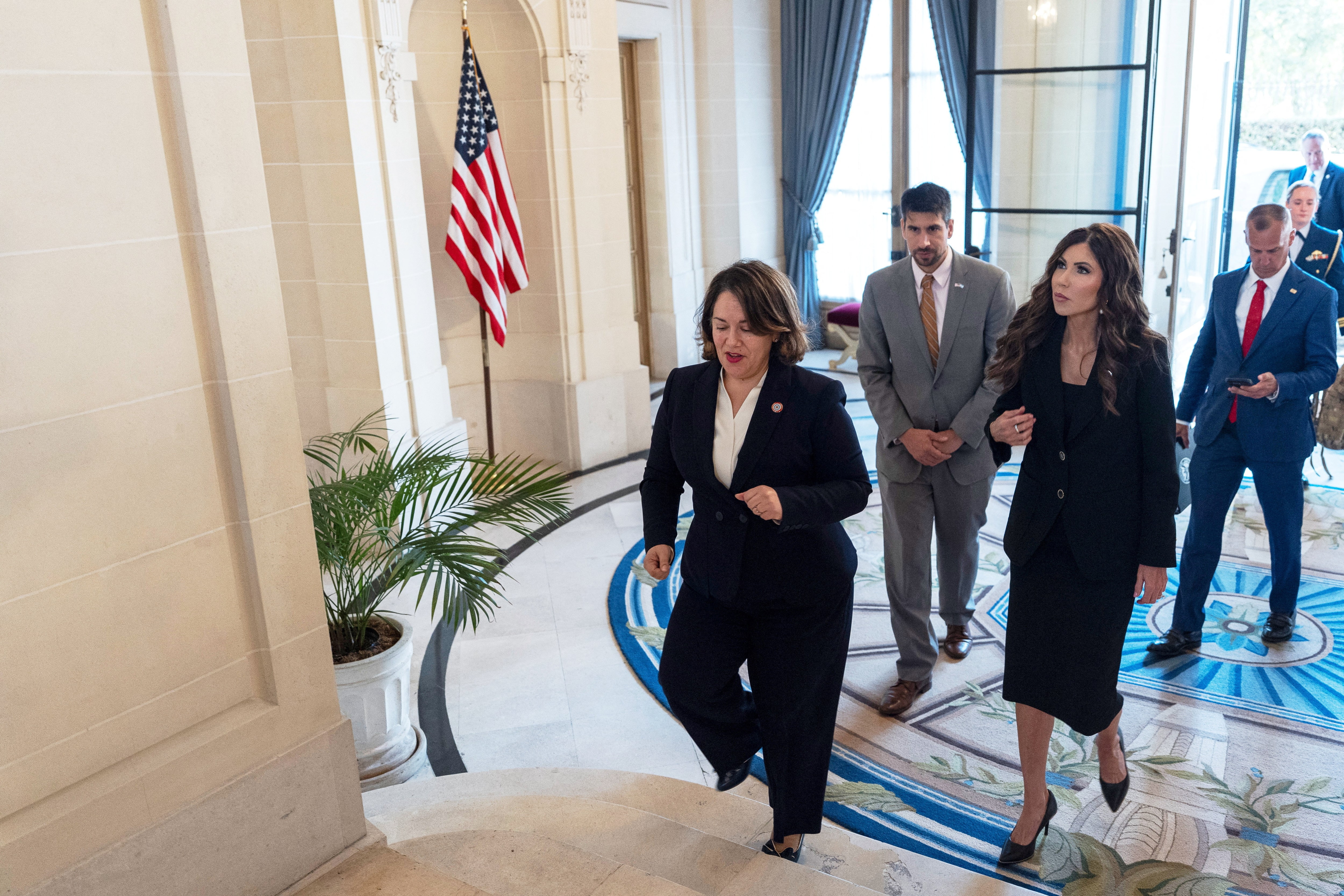 2025年7月28日,美國國土安全部長克里斯蒂·諾姆與美國駐阿根廷大使館臨時代辦海蒂·戈麥斯一同抵達阿根廷布宜諾斯艾利斯的博世宮。 Alex Brandon/Pool via REUTERS 購買授權 權利, 打開新標籤頁路透布宜諾斯艾利斯7月28日電 - 美國國土安全部(DHS)在一份聲明中表示,美國週一簽署了一份意向聲明,將再次接納阿根廷加入其免簽證計劃。