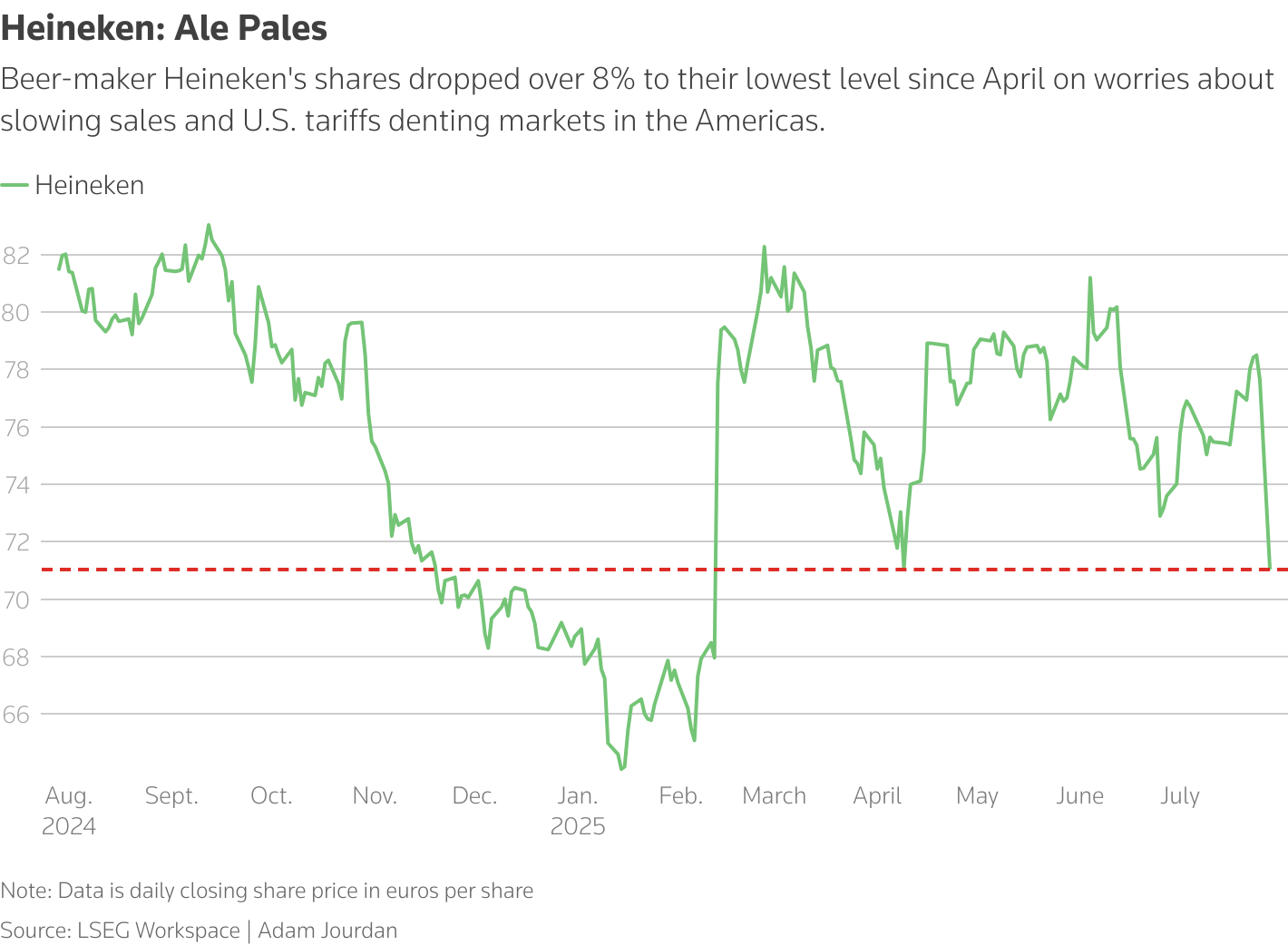 分析師和投資者指出,喜力預警今年剩餘時間銷量將低於預期,因美國總統特朗普的貿易戰衝擊美洲市場。同時與零售商的定價糾紛也影響了歐洲銷量。該公司從歐洲和墨西哥向美國出口啤酒(特別是其同名拉格啤酒),在巴西等關鍵市場還遭受了消費者信心受挫的間接影響。