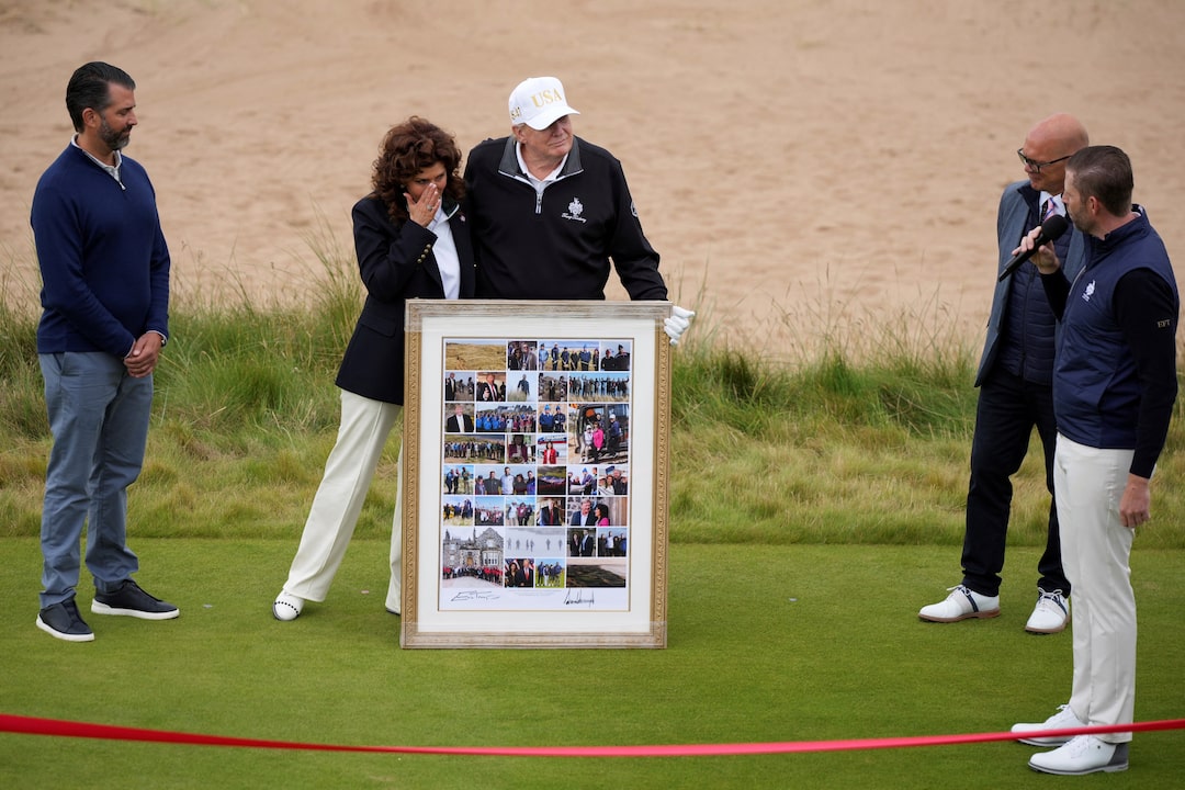 廣告·繼續滾動在與斯塔默的會談中,特朗普表示不同意內塔尼亞胡關於加沙不存在饑荒的評估,同時為俄羅斯總統普京設定了更緊迫的最後期限以推動結束烏克蘭戰爭。在長子埃裏克·特朗普和次子小唐納德·特朗普的陪同下,以及數名孫輩圍繞左右,特朗普在蘇格蘭東北部沙丘間的新高爾夫球場開球前,盛讚了球場的壯麗景緻。