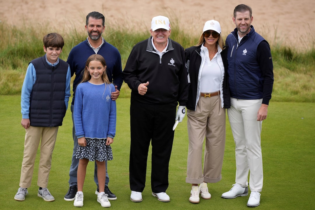 廣告·繼續滾動在與斯塔默的會談中,特朗普表示不同意內塔尼亞胡關於加沙不存在饑荒的評估,同時為俄羅斯總統普京設定了更緊迫的最後期限以推動結束烏克蘭戰爭。在長子埃裏克·特朗普和次子小唐納德·特朗普的陪同下,以及數名孫輩圍繞左右,特朗普在蘇格蘭東北部沙丘間的新高爾夫球場開球前,盛讚了球場的壯麗景緻。