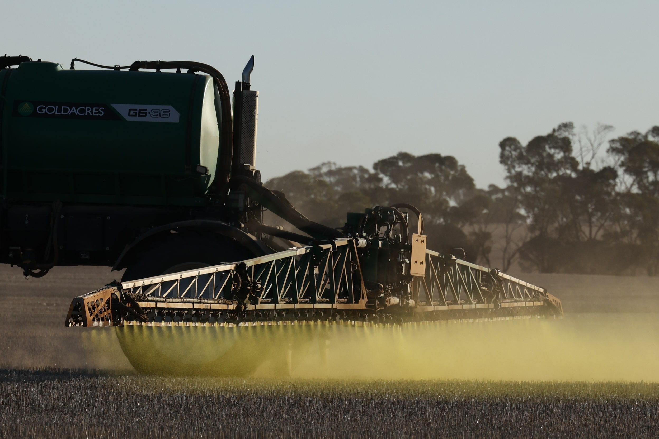 澳大利亞本卡賓附近的一個農場,一台作物噴霧機正在噴灑除草劑。路透社/霍莉·亞當斯