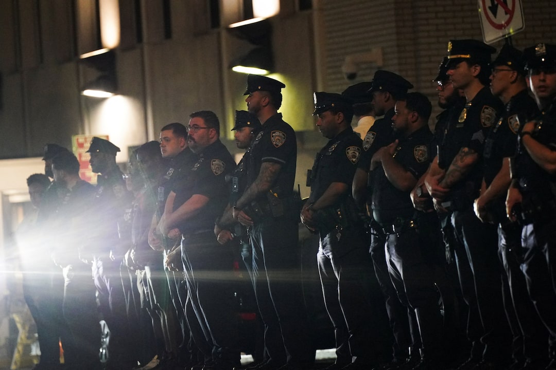 圖1/3:2025年7月29日,美國紐約市紐約長老會/威爾康奈爾醫療中心,紐約警察局警員們等待運送在曼哈頓中城大規模槍擊事件中遇害的同僚迪達魯爾·伊斯蘭的救護車。路透社/Bing Guan