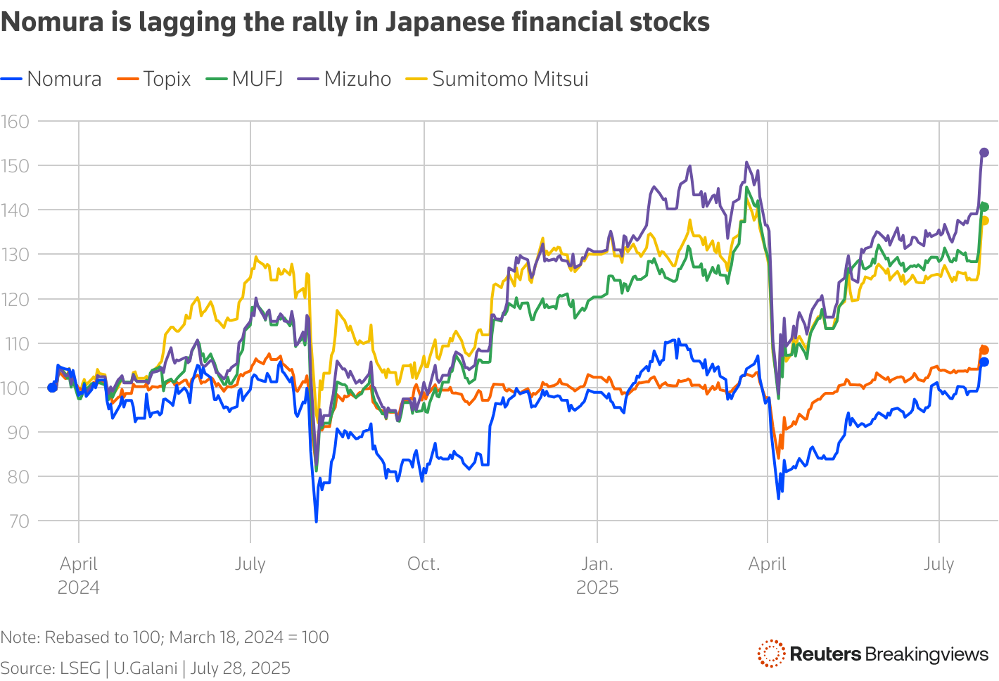 資料圖片:2022年5月17日,日本東京,野村控股首席執行官奧田健太郎出席新聞發佈會。路透社/Issei Kato/資料圖片購買授權權利,新標籤頁打開香港,7月29日(路透社Breakingviews)- 日本在經歷數十年的通縮後進入新的經濟時代,正推動企業活動激增並令全球投資者興奮。但觀察野村控股(8604.T),新標籤頁打開平淡的股價,你可能察覺不到這一點。投資者對該公司可能再次陷入醜聞的擔憂或許能部分解釋這一現象。但關鍵因素在於首席執行官奧田健太郎正在海外追求長期增長。這一戰略似乎並未損害業績。這家200億美元的銀行上季度延續了穩健的盈利態勢,新標籤頁打開。受包含投行業務的批發部門推動,淨利潤同比增長52%至1045.7億日元(約合7.05億美元)。剔除出售東京房產等一次性項目後,公司年化股本回報率約為8.5%,剛好達到目標區間。路透每日簡報為您提供開啓一天所需的全部新聞。立即訂閲此處。