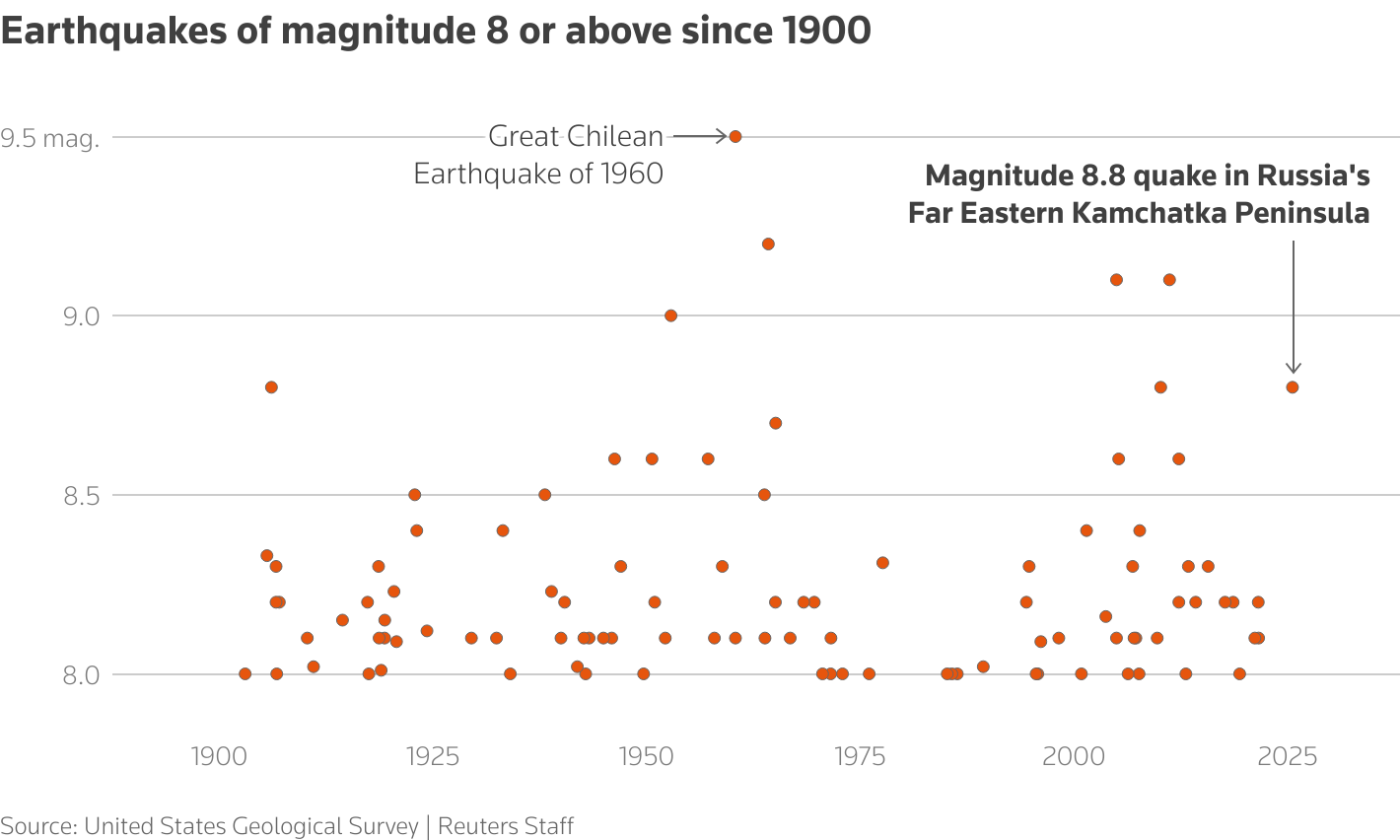 7月30日(路透社)——俄羅斯遠東堪察加半島附近發生8.8級強震,引發4米高海嘯,太平洋沿岸地區已發佈全面疏散指令。