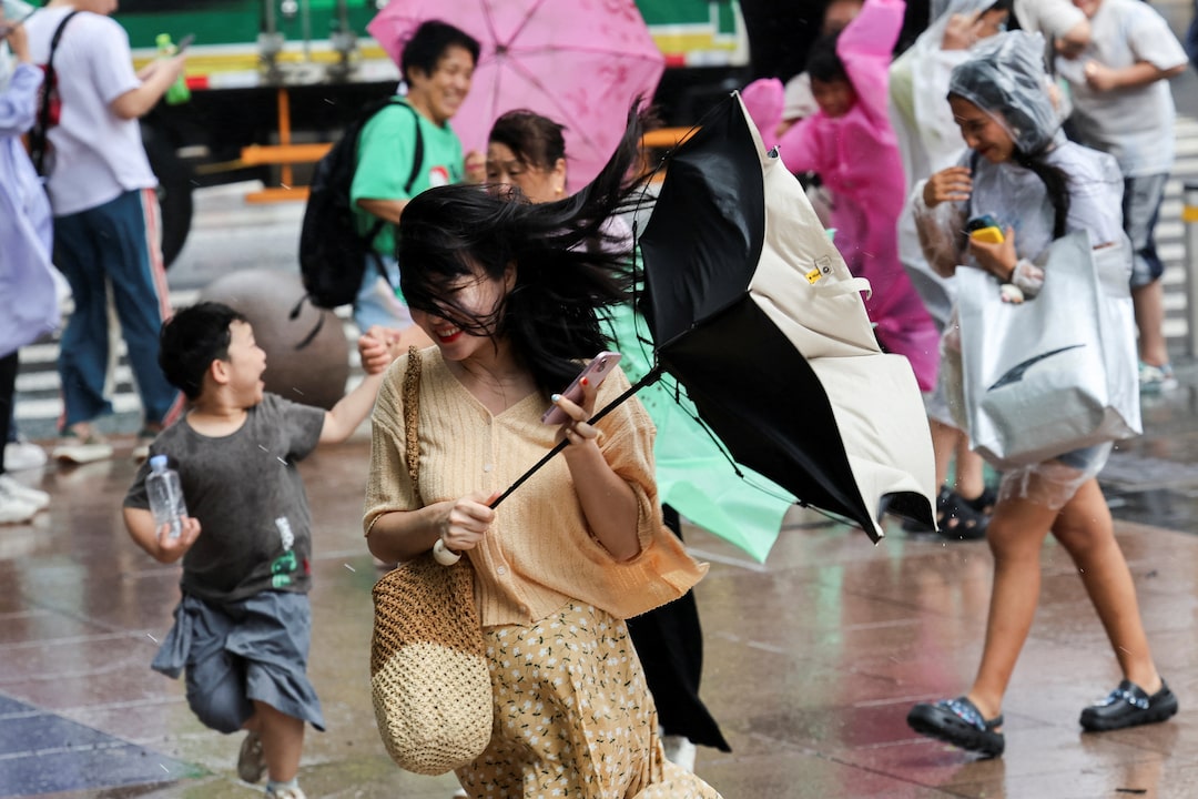 圖1/4 2025年7月30日,熱帶風暴"科美"在中國上海附近城市登陸後,民眾用雨傘和雨衣抵禦暴雨狂風。路透社/Go Nakamura