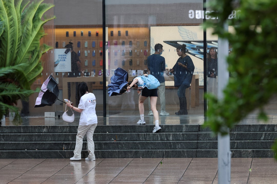 圖1/4 2025年7月30日,熱帶風暴"科美"在中國上海附近城市登陸後,民眾用雨傘和雨衣抵禦暴雨狂風。路透社/Go Nakamura