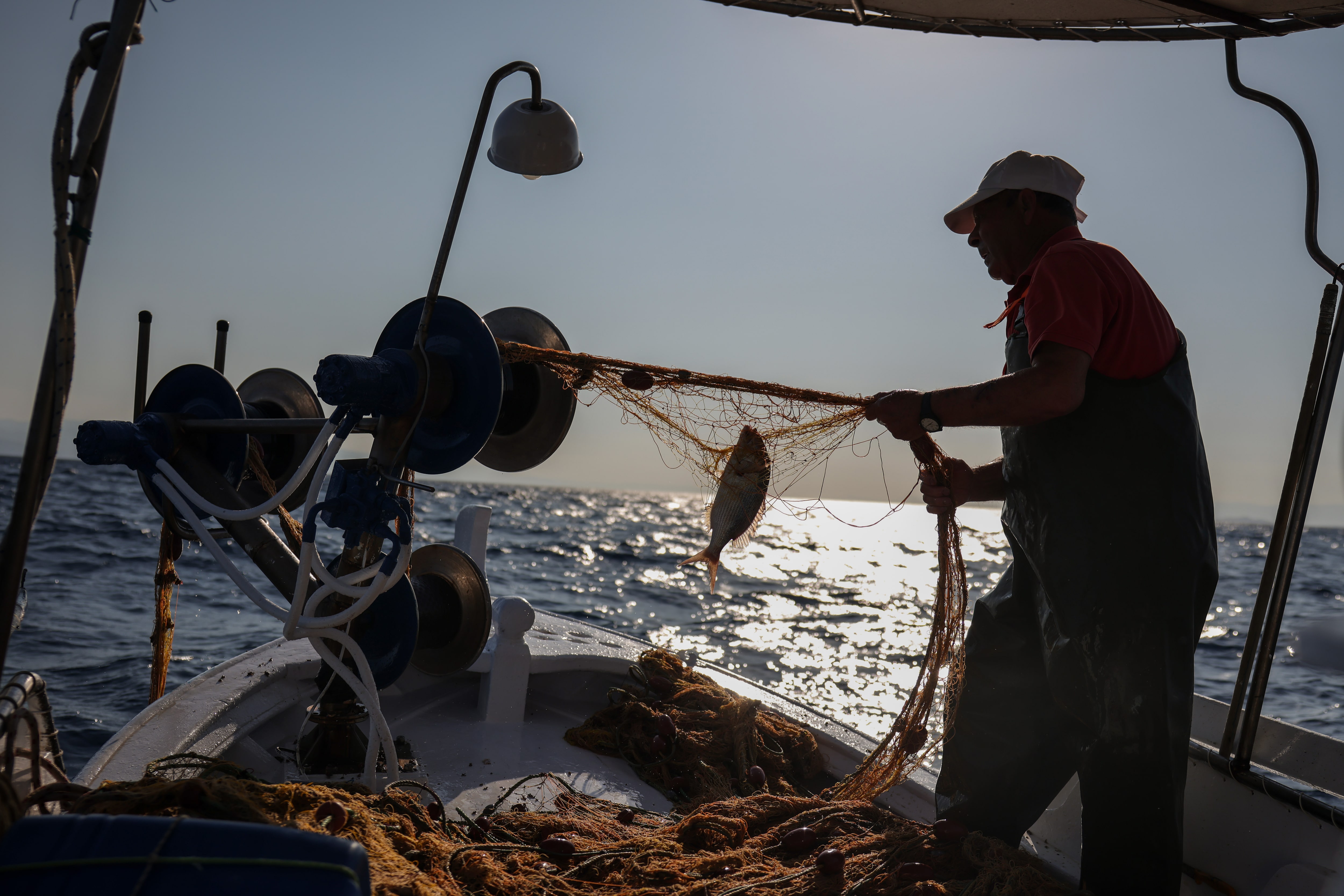 2025年6月28日,希臘萊斯博斯島附近特索尼婭海域,70歲漁民薩諾斯·馬爾馬裏諾斯正在收漁網。路透社/Louisa Gouliamaki這類威懾措施使歐洲移民數量自2015年危機以來大幅減少,但人權組織指出,這會讓試圖入境者面臨生命危險。