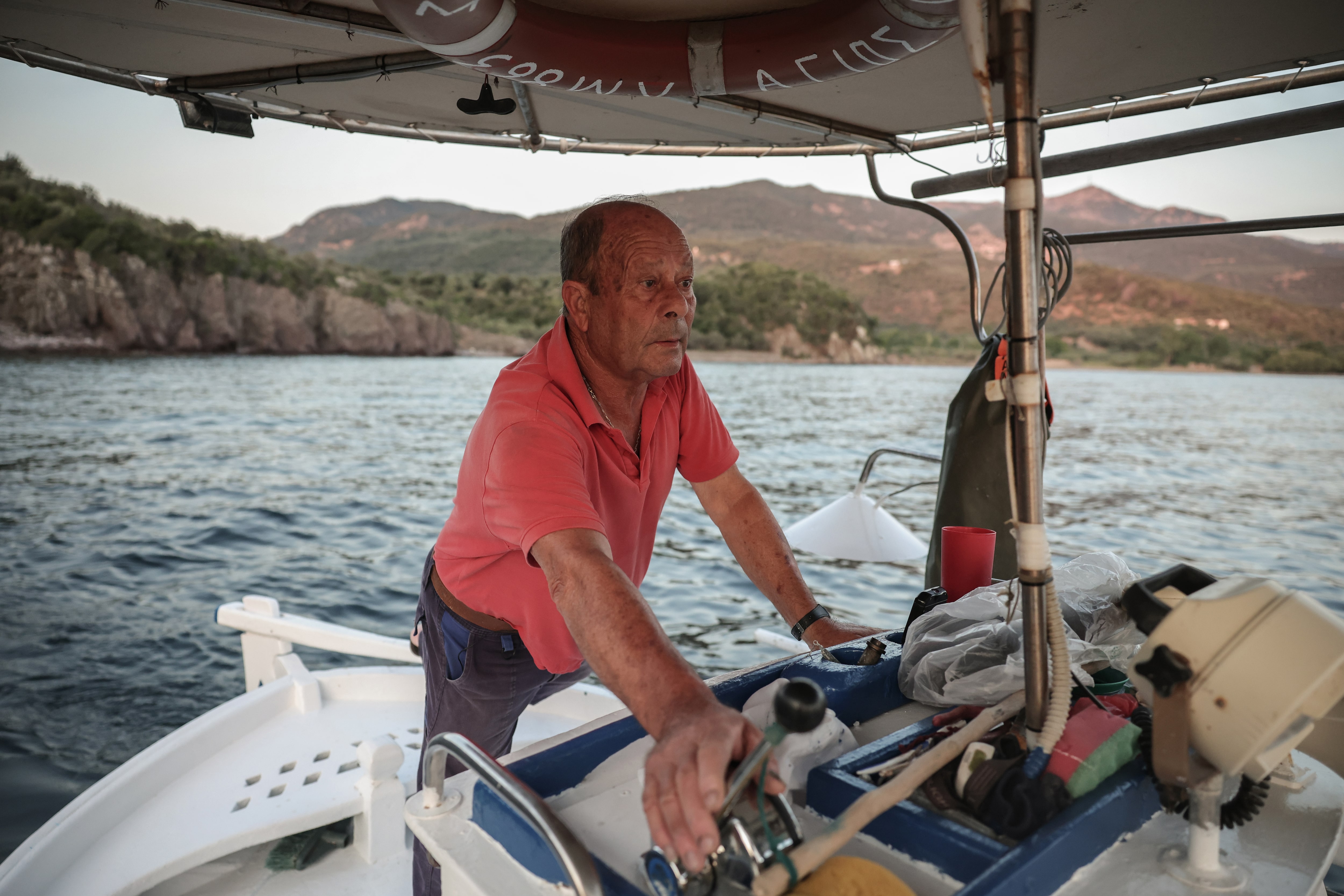 2025年6月28日,希臘萊斯博斯島附近的斯卡拉西卡米亞斯海域,70歲的漁民塔諾斯·馬爾馬裏諾斯駕駛着他的漁船。路透社/路易莎·古利亞馬基馬爾馬裏諾斯表示,2015年他花了大量時間幫助移民,以至於幾乎沒賺到什麼捕魚的收入。這次,他不太願意靠近那艘船,以防與海岸警衞隊發生麻煩。他遠遠地觀望着。他説,如果他們需要他,他會提供幫助。