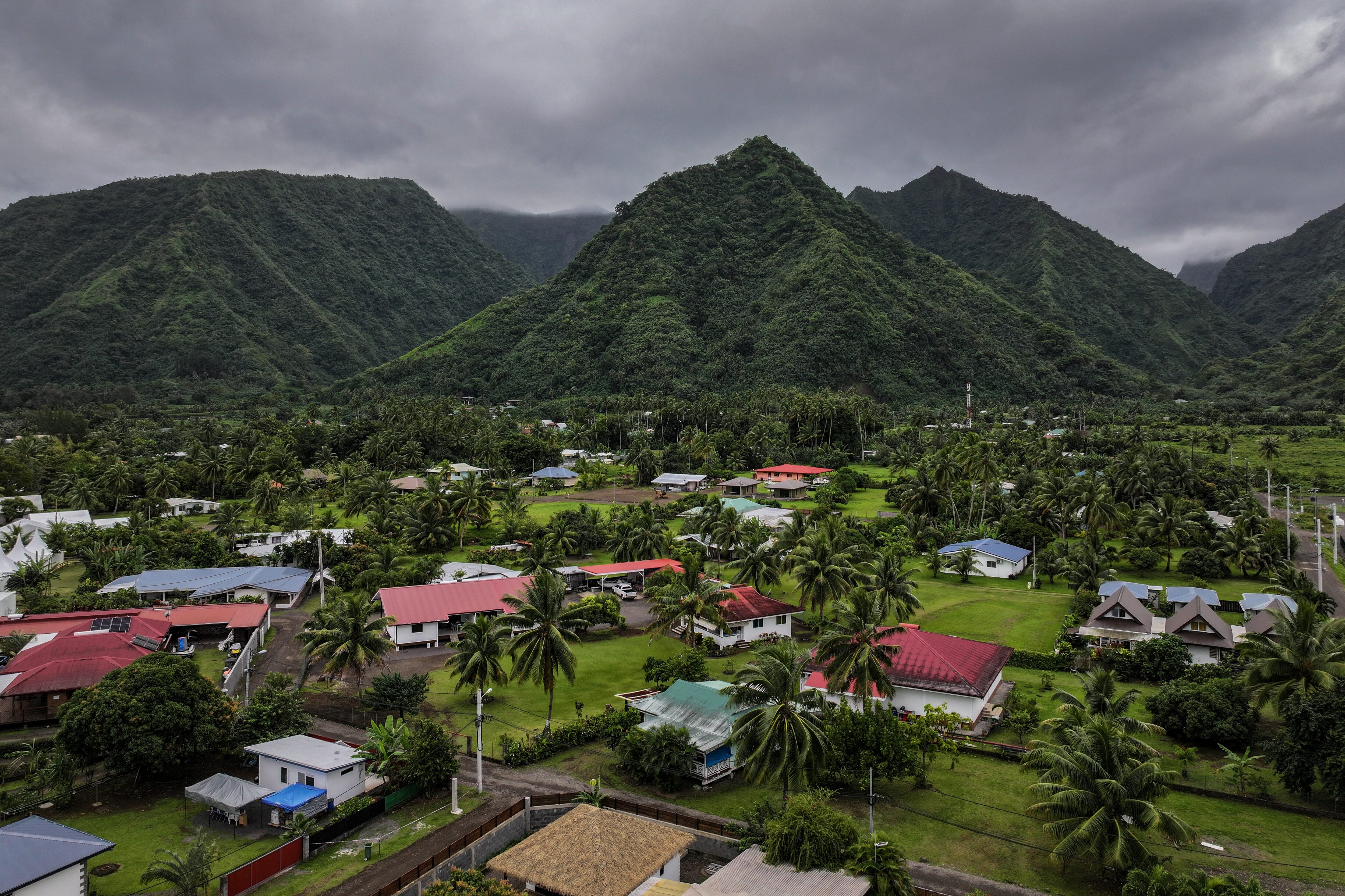 檔案照片。法屬波利尼西亞塔希提島Teahupo’o村莊的全景。2024年8月10日。路透社/Carlos Barria 購買授權 許可, 打開新標籤頁巴黎,7月30日(路透社) - 據當地當局稱,海嘯波於週三凌晨開始抵達法屬波利尼西亞的馬克薩斯羣島,但預計其規模將小於最初擔憂的程度。