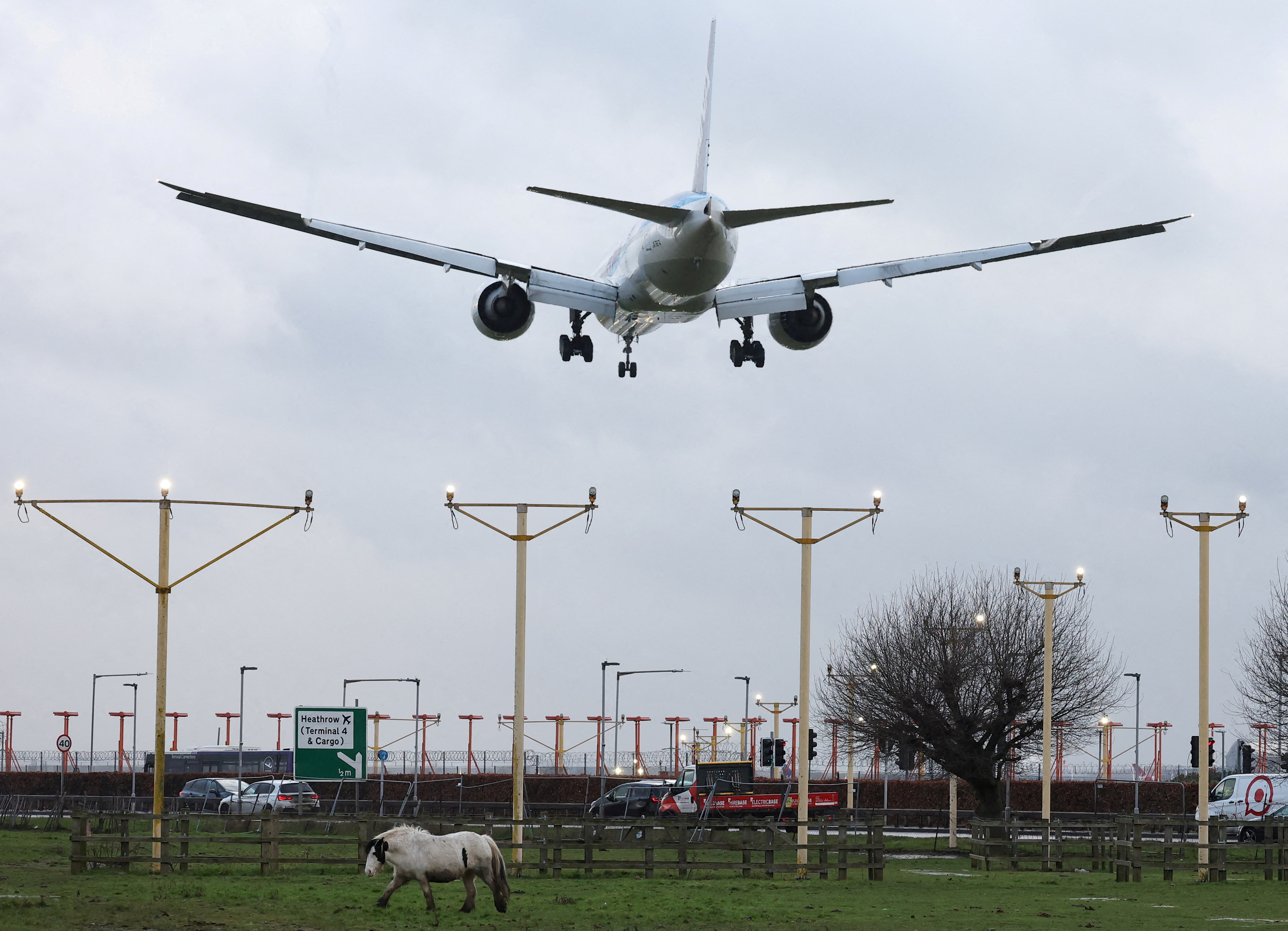 2025年1月28日,英國倫敦西部,一架客機在降落希思羅機場時飛越正在吃草的馬匹。路透社/託比·梅爾維爾/資料圖片購買授權許可,打開新標籤頁倫敦,7月31日(路透社)—— 週四,英國機場有近二十多個進出港航班被取消,此前一天英國空中交通管制系統出現技術問題,導致全國範圍內的大範圍混亂。