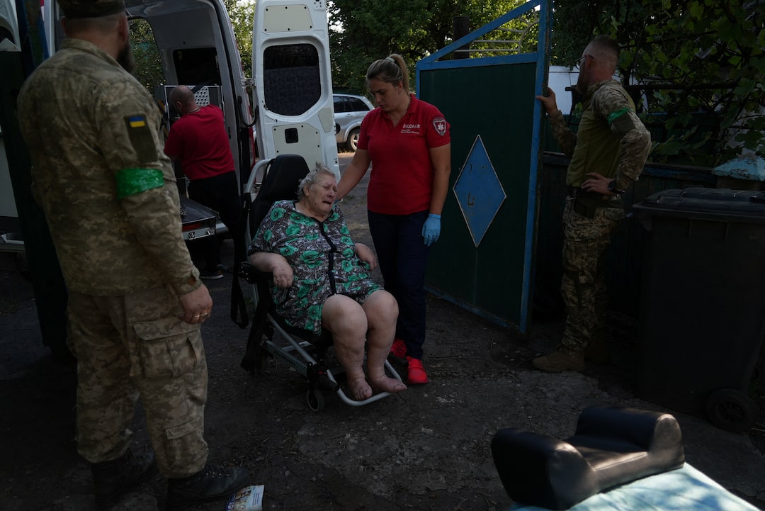 圖1/5 2025年7月29日,烏克蘭頓涅茨克地區,在俄羅斯攻擊烏克蘭期間,烏克蘭軍人協助志願者從前線城鎮多布羅皮利亞撤離一名居民。路透社/Inna Varenytsia