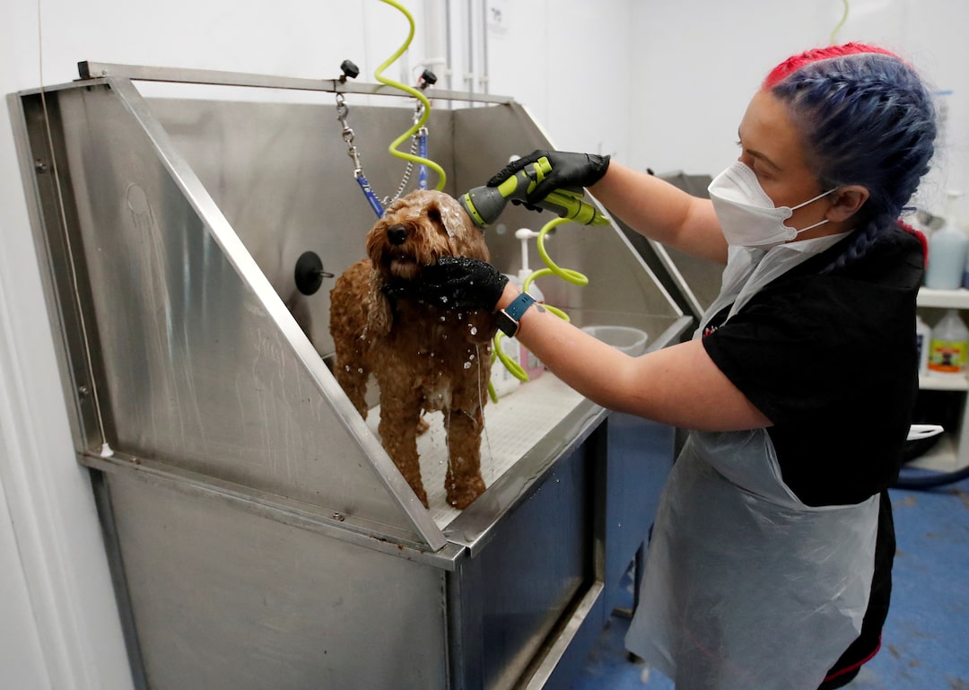 圖1/2 2020年6月8日,英國米爾頓凱恩斯,家庭寵物店"The Groom Room"內,一名寵物美容師正在為狗狗打理毛髮。路透社/安德魯·博耶斯/資料圖