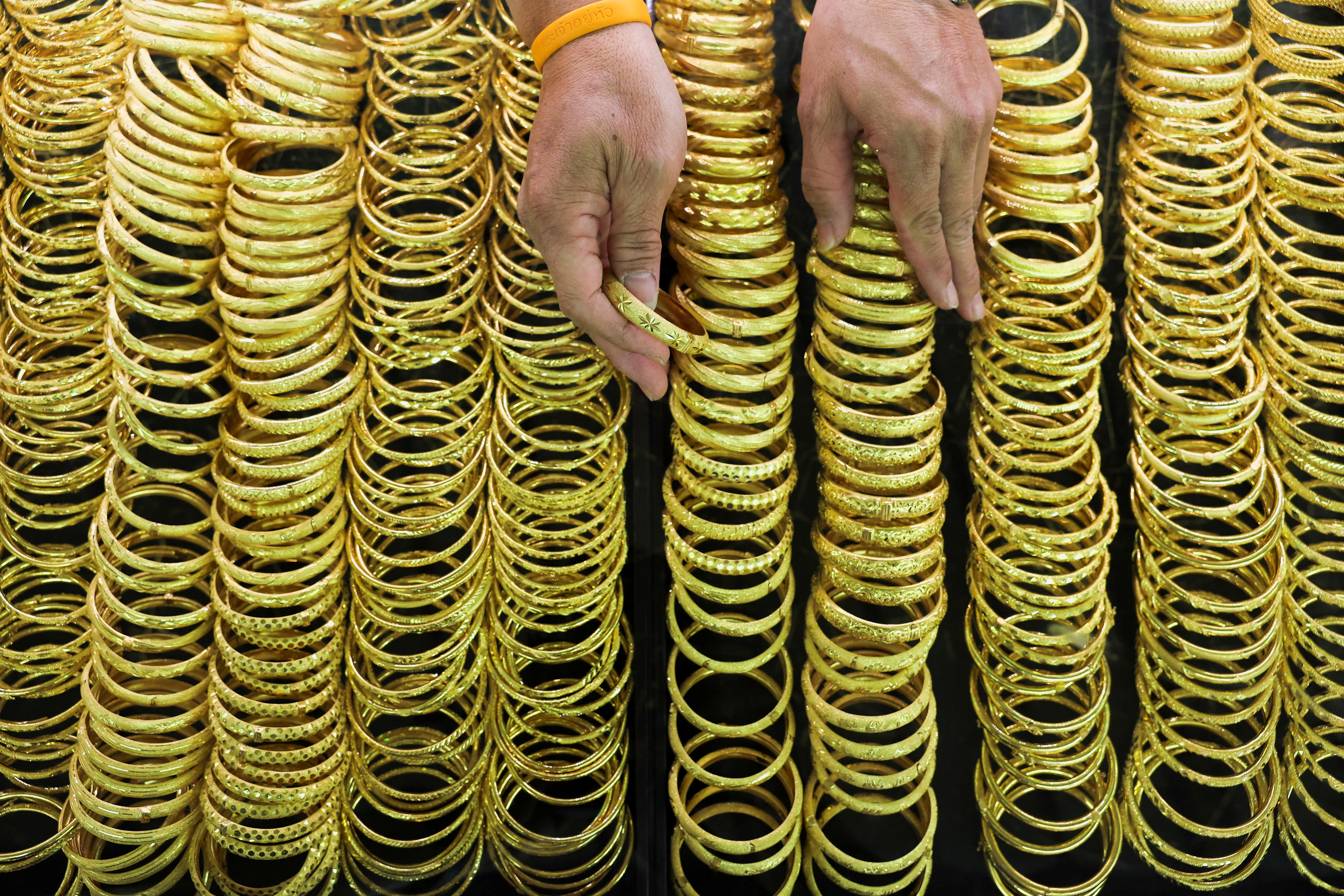 2025年1月27日,泰國曼谷唐人街金店內,一名黃金銷售員正在整理金手鐲。路透社/查利尼·提拉蘇帕/資料圖購買授權許可,打開新標籤頁8月4日(路透社)——由於上週經濟數據強化了市場對美聯儲降息的預期,週一黃金價格連續第三個交易日上漲。