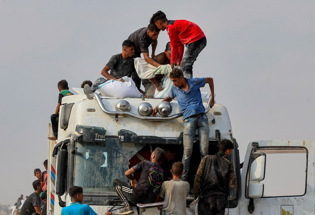 2025年8月12日,加沙地帶南部汗尤尼斯,巴勒斯坦人爭相從以色列進入的卡車上收集援助物資。路透社/Hatem Khaled